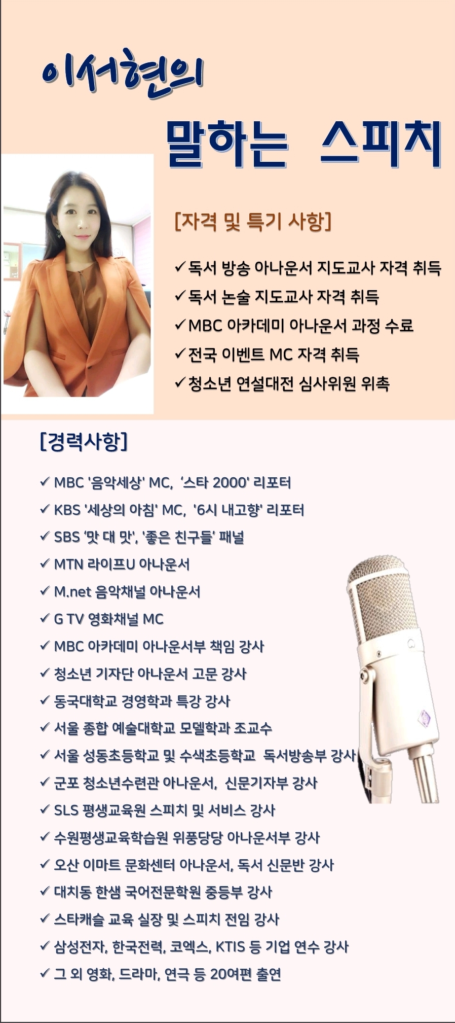 첨부파일 연설대전 포스터.hwp 원장 이서현 아나운서는 5년 방송 경력에 8년 강사 경력과 학원운영 경험을 토대로 동탄에 '말하는 스피치 연기' 학원을 오픈하여 교육사업에 열정을 쏟고 있습니다. 자신감...