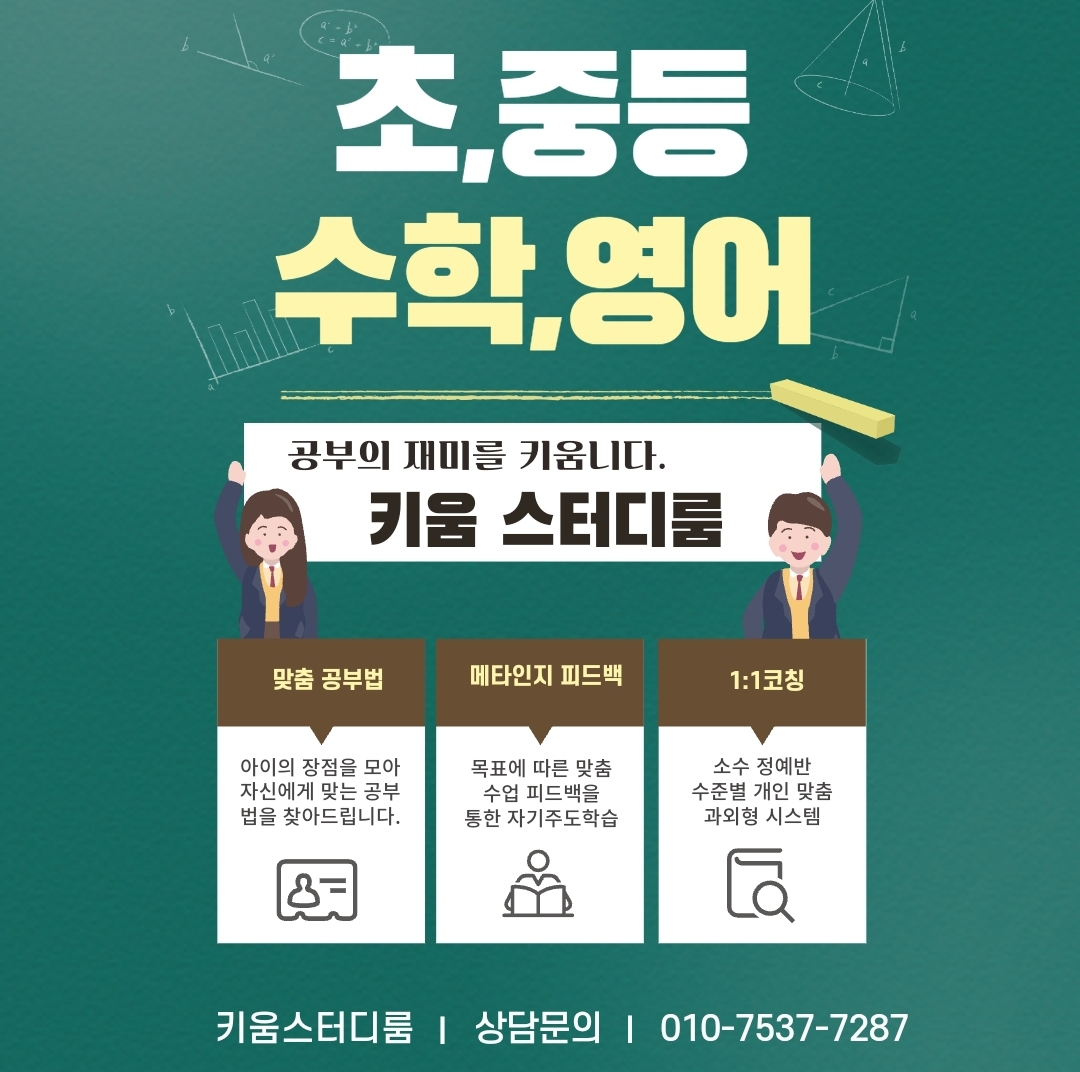 스터디카페 이용 가능, 열공 분위기 조성! 초등부 모집 안내 "초등부 친구들 모여라!!" 초등 수학의 기본 개념 탄탄히! 응용 문제 해결력 UP! 중등 과정과 연계된 학습 제공 상담 및 문의 학원명: 키움...
