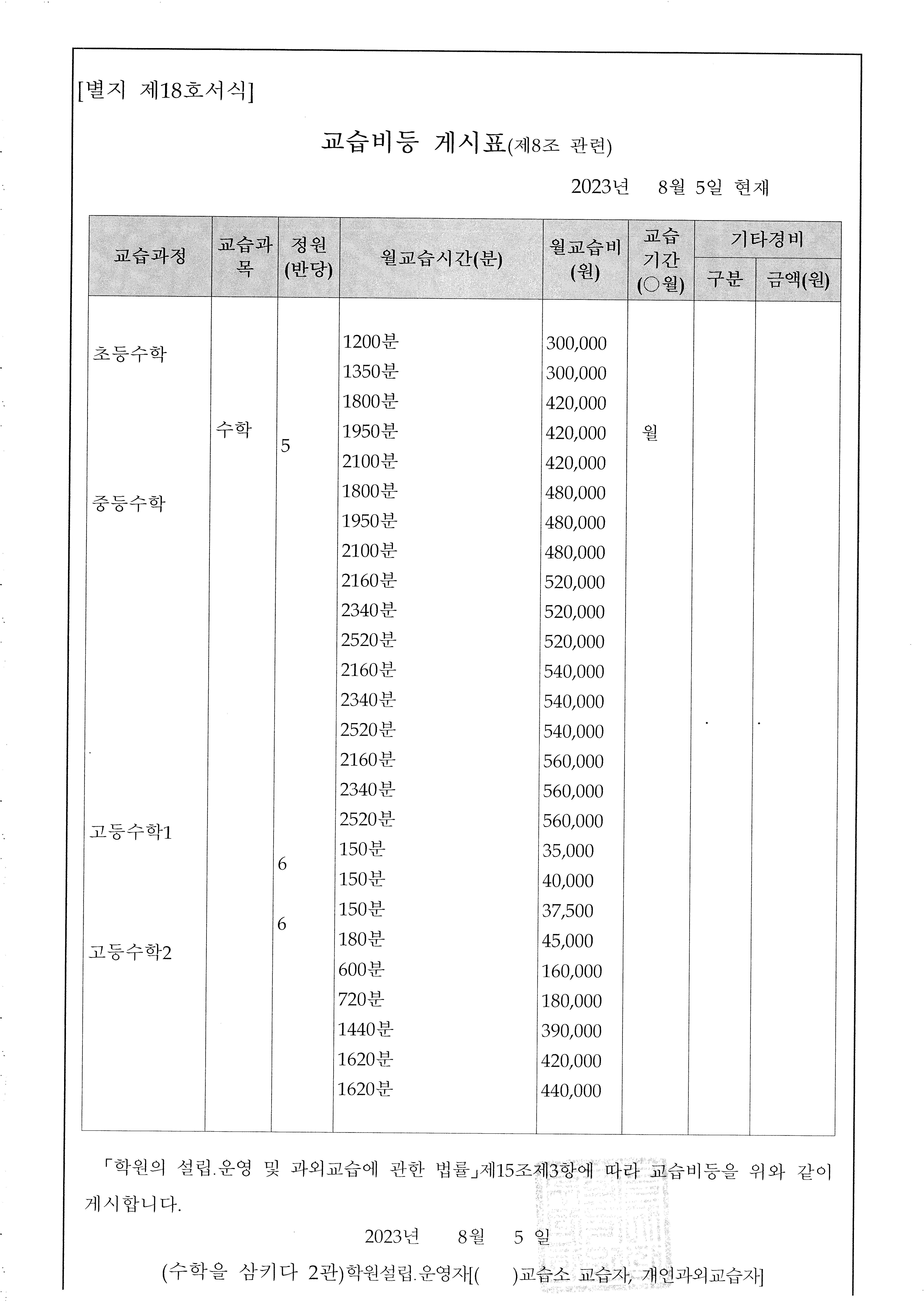 학원 수강료 공지(칼수학2관학원)