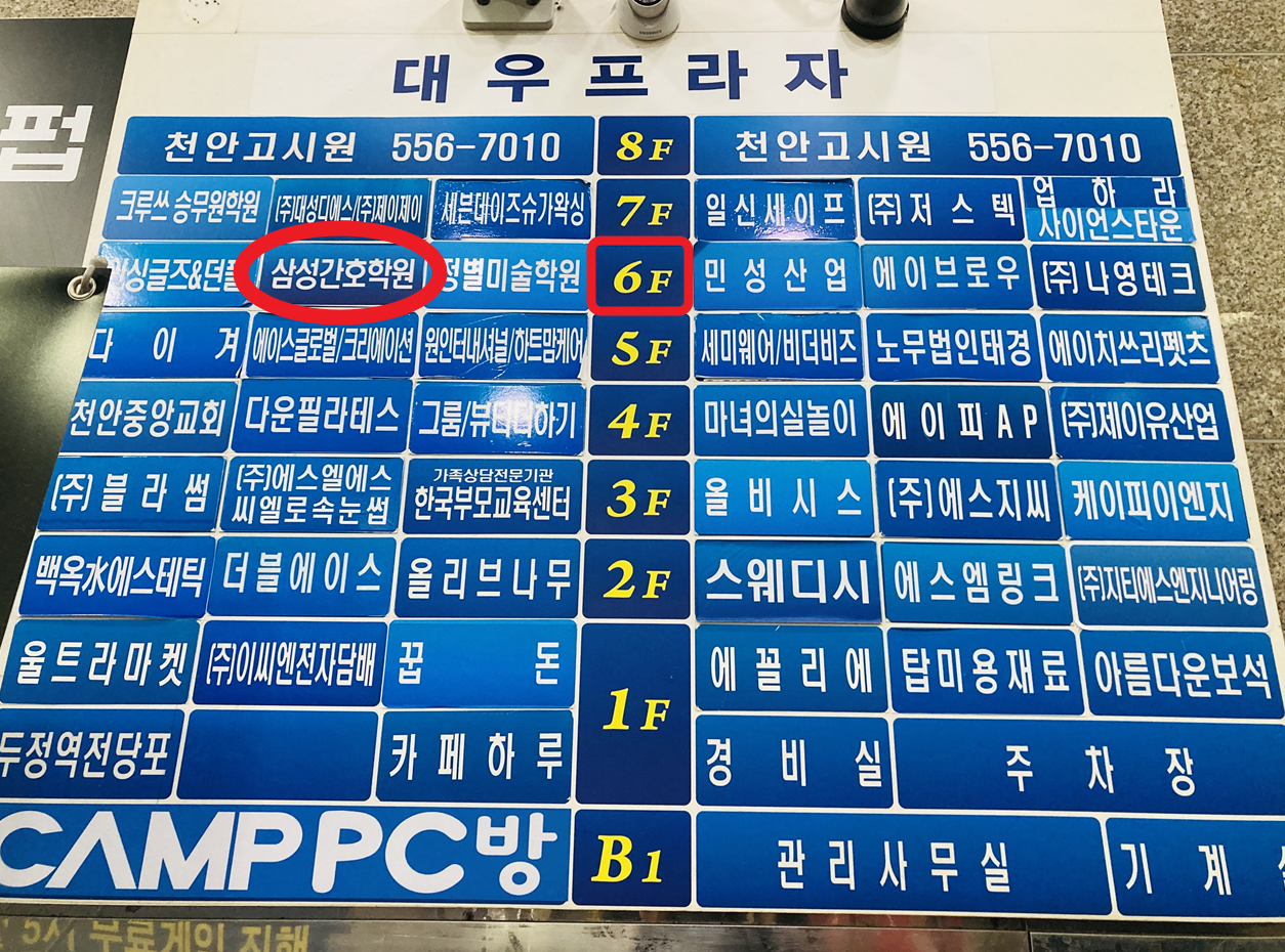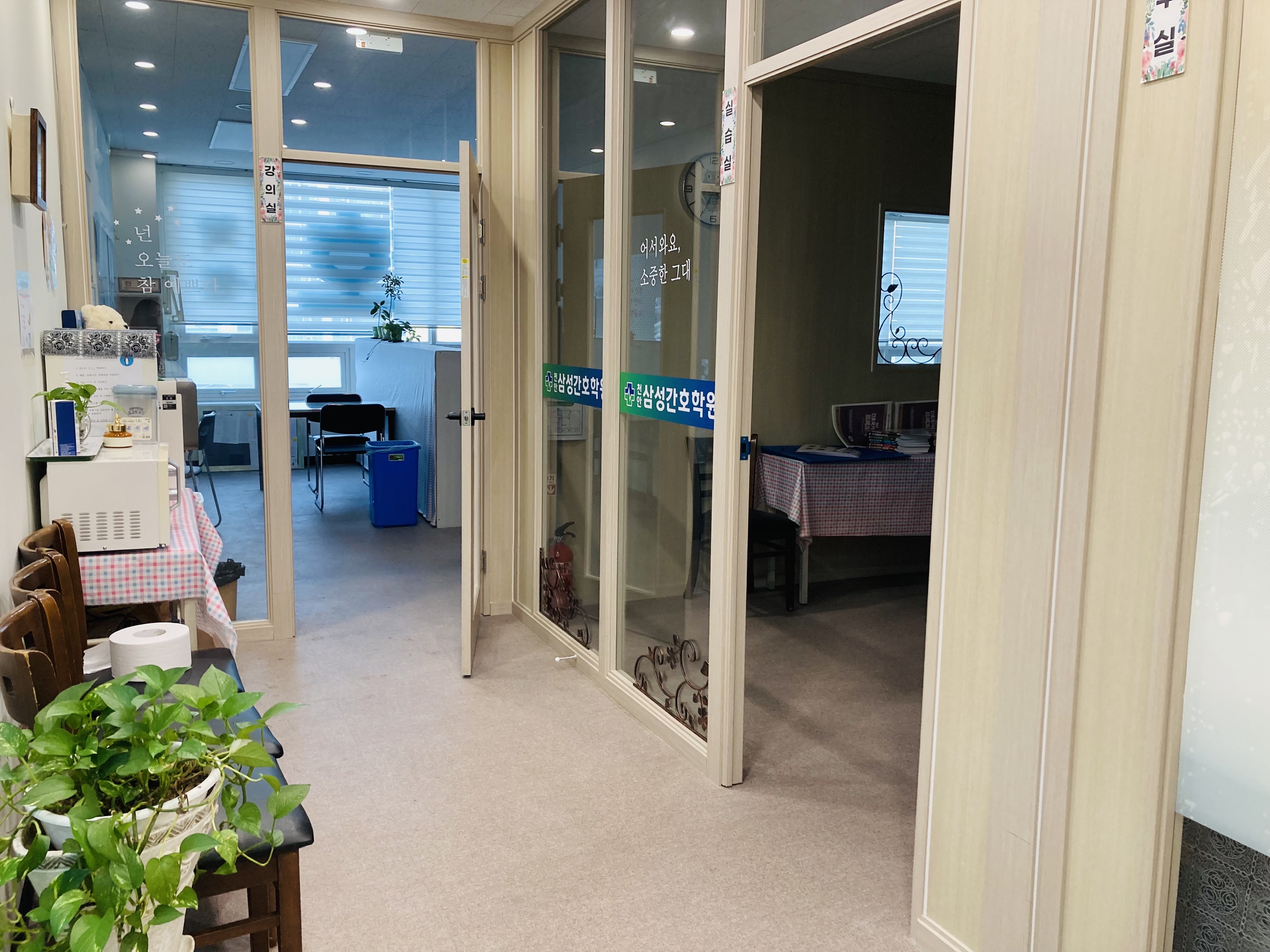 안녕하세요, 삼성간호학원입니다. 본격 천안삼성간호학원의 시설 파헤치기! 이제 입구로 들어서서 학원의 내부모습도 함께 구경해볼까요? 입구의 작은 복도를 지나~ 천안 삼성간호학원의 시그니처, 파란문을...