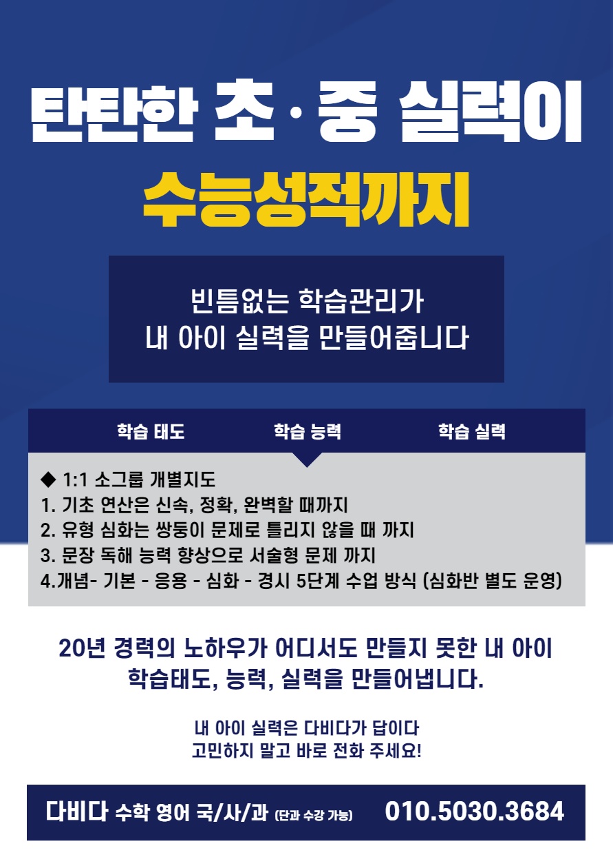 결과로 증명하는 풍무동 수학학원 다비다학원입니다. 2024 신풍초, 풍무초, 양도중, 풍무중 학생들 신규 모집을 합니다. 과외식 소수정예 다비다학원은 이전에 공부를 많이 안해봤던 학생, 학원을 다닌...