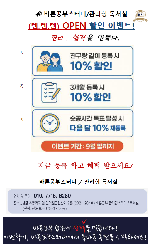 저 또한 그랬었는데요 그래서 바른공부 스터디라는 독서실을 알게 됐고, 취지나 시스템이 좋아 보여 등록하게 되었어요 바른공부 스터디는 그냥 단순한 독서실이 아니라 학생 스스로 공부하는 습관을 길러주는...