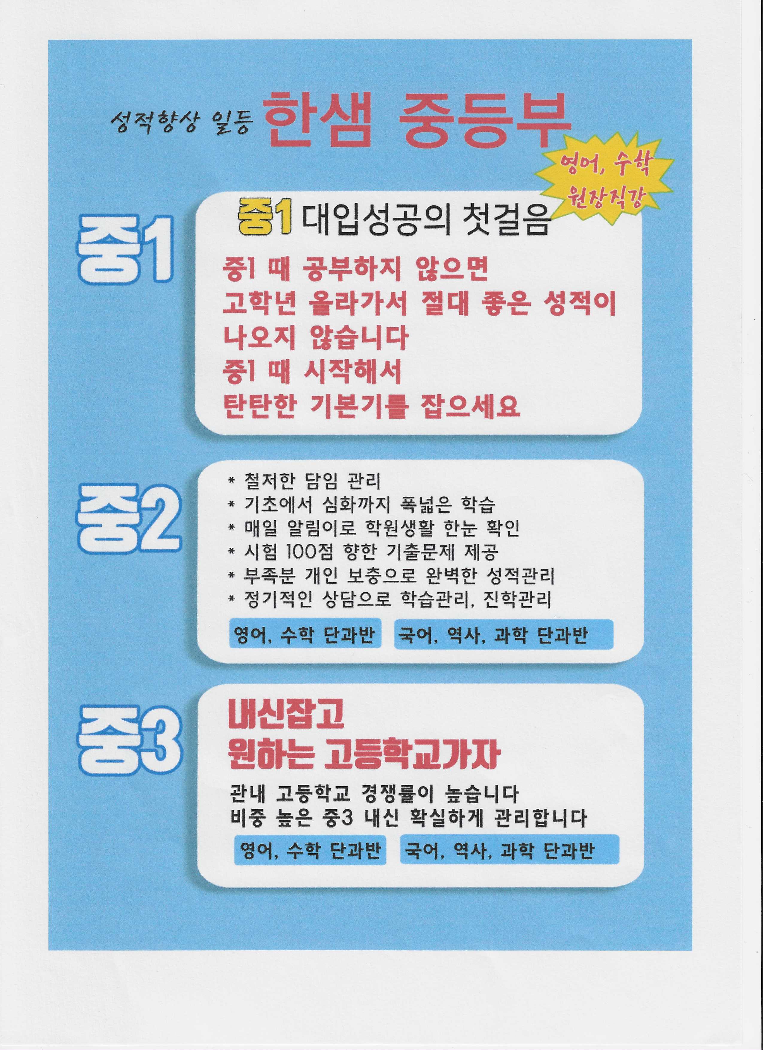 [한샘학원] 명문대의 지름길... 중.고 입시전문학원 / 상담환영