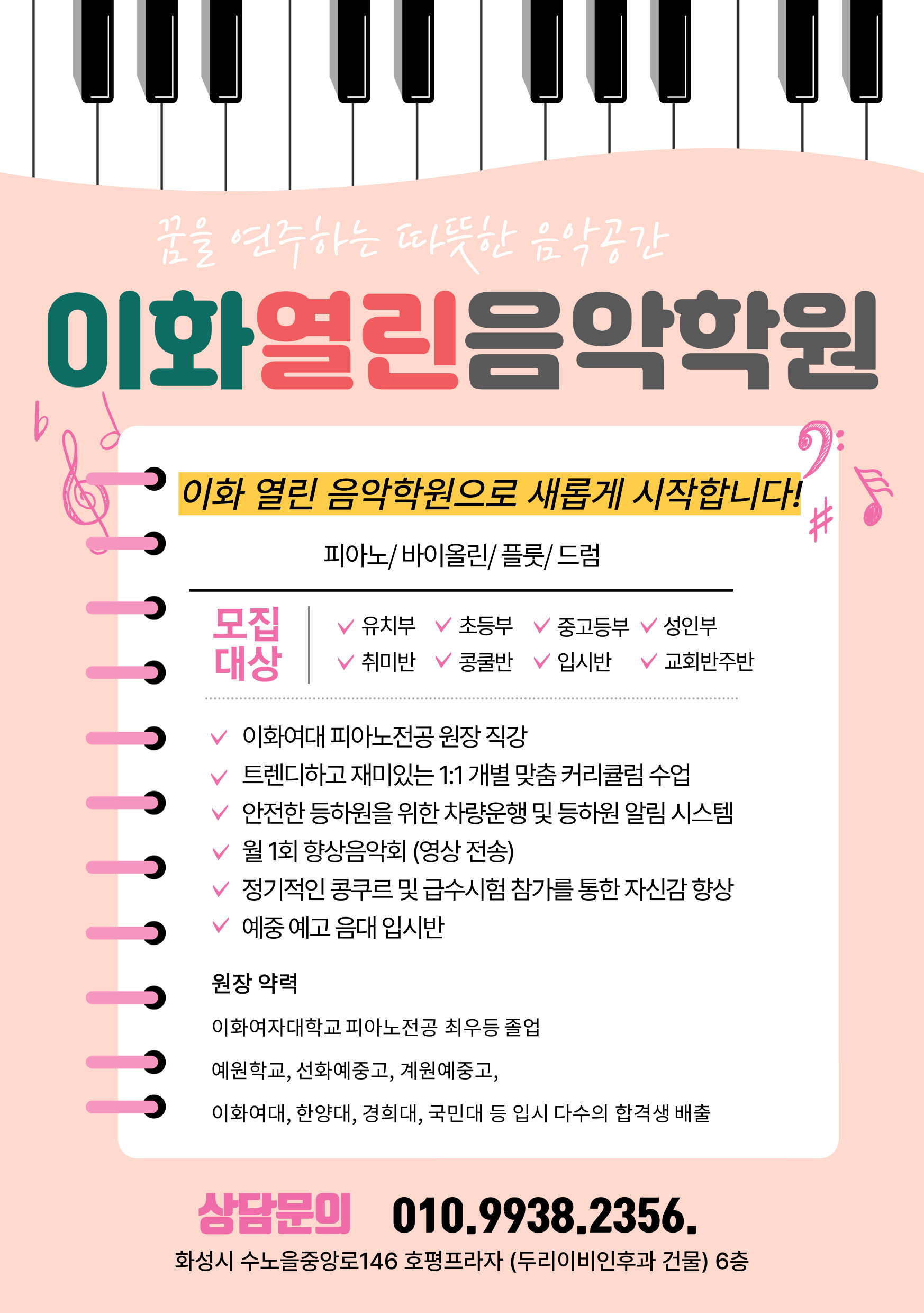 "다름이 꽃 피워 아름다움이 되는 , 이화음악학원" 1. "다름이 어우러져 아름다운 하모니를 만드는 곳... 틀에 갇히지 않는 열린 음악 교육이 아이들의 감성을 더욱 풍요롭게 합니다." 3. 원장 경력20년이상...