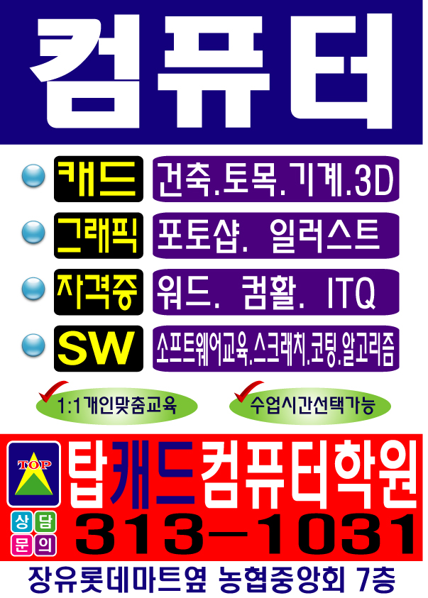 ■ 탑캐드 컴퓨터학원 주말반 모집 ■ ★ 인원 : 오전타임(5명) 오후타임(5명) 소수정예 모집 ★ 대상 : 초,중,고등학생 ★ 요일 : 매주 토요일 ★ 시간 : - 오전반 [ 11:00 ] ~ [ 12:00 ] - 오후반 [ 1:00 ] ~ [ 2...