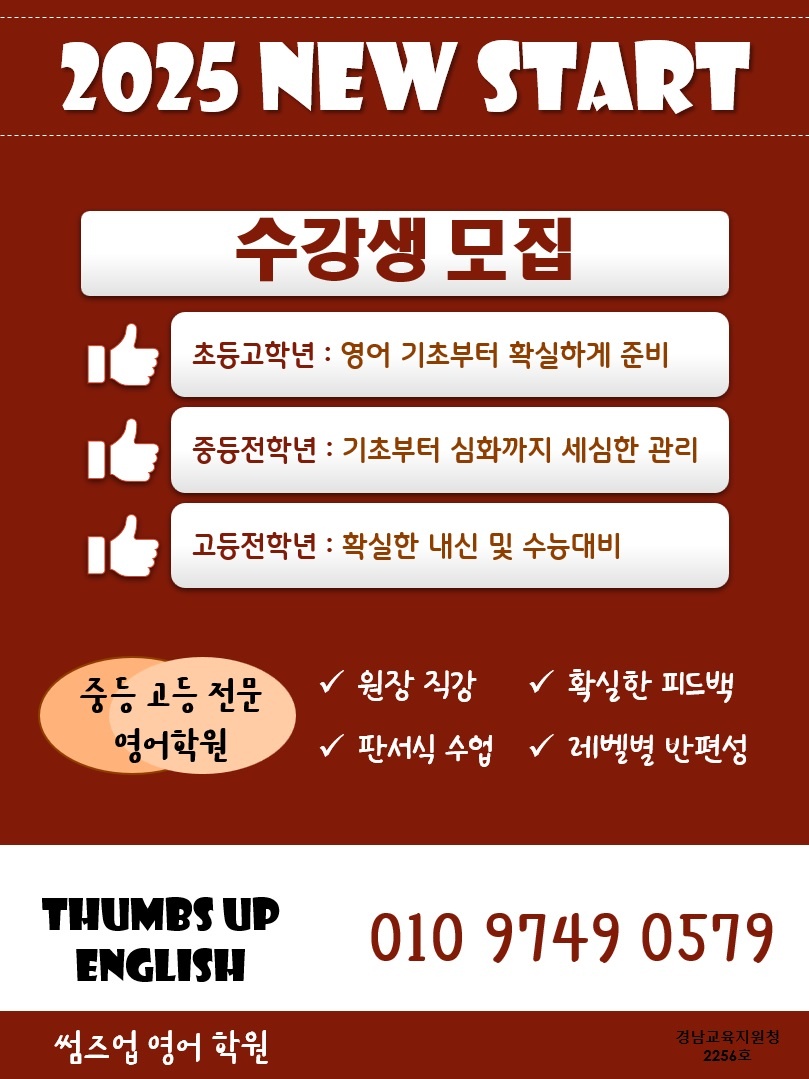 때는 영어 기본 문법뿐만 아니라 영작 능력 및 독해 그리고 어휘 능력이 상당히 중요하고 저희 학원... 상담문의 010 **** **** (문자, 전화, 카톡 상담가능합니다) 경남교육지원청 2256호 썸즈업영어학원...