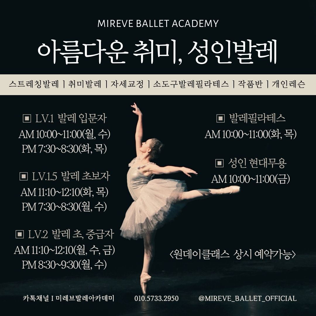미레브 발레 학원에서 방학 동안 아이들의 기본기·체력·표현력을 균형 있게 키워줄 겨울방학... 2950 카카오톡 채널 | 미레브발레아카데미 카카오톡 상담문의 | http://pf.kakao.com/_mnLwG 인스타그램 | mireve...