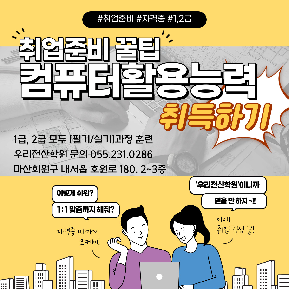 사람, 학원 취업지원 받고 싶음, 강제성 필요한 사람 자주 묻는 질문 전산회계부터 꼭 따야 하나요?... 우리에게는 계산기가 있어요! (시험 볼 때도 쌀집 계산기 챙겨갑니다.) 프로그램 어렵지 않나요?...