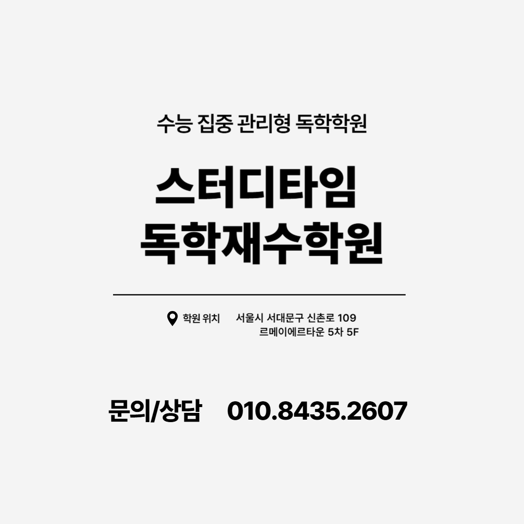 안녕하세요 스터디타임 독학재수학원입니다. 26학년도 수능 이후 프리윈터스쿨 / 프리독학N수반... 스터디타임에서는 '감독 시스템'과 '규칙적인 생활 관리'로 집중할 수밖에 없는 학습 루틴을 제공합니다....