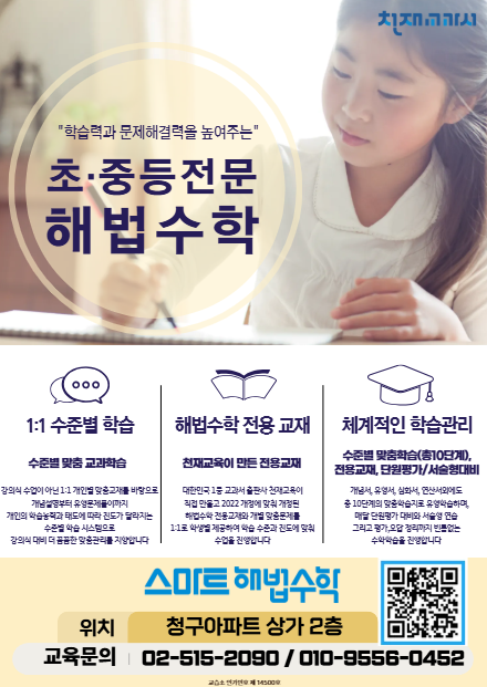 안녕하세요~ 스마트해법수학 삼성봉은초 아카데미 입니다. 스마트해법수학 삼성봉은초 아카데미는... 해법수학의 수업은 강의식이 아닌 개별지도 방식입니다. 기초가 필요한 아이부터 수학영재에...