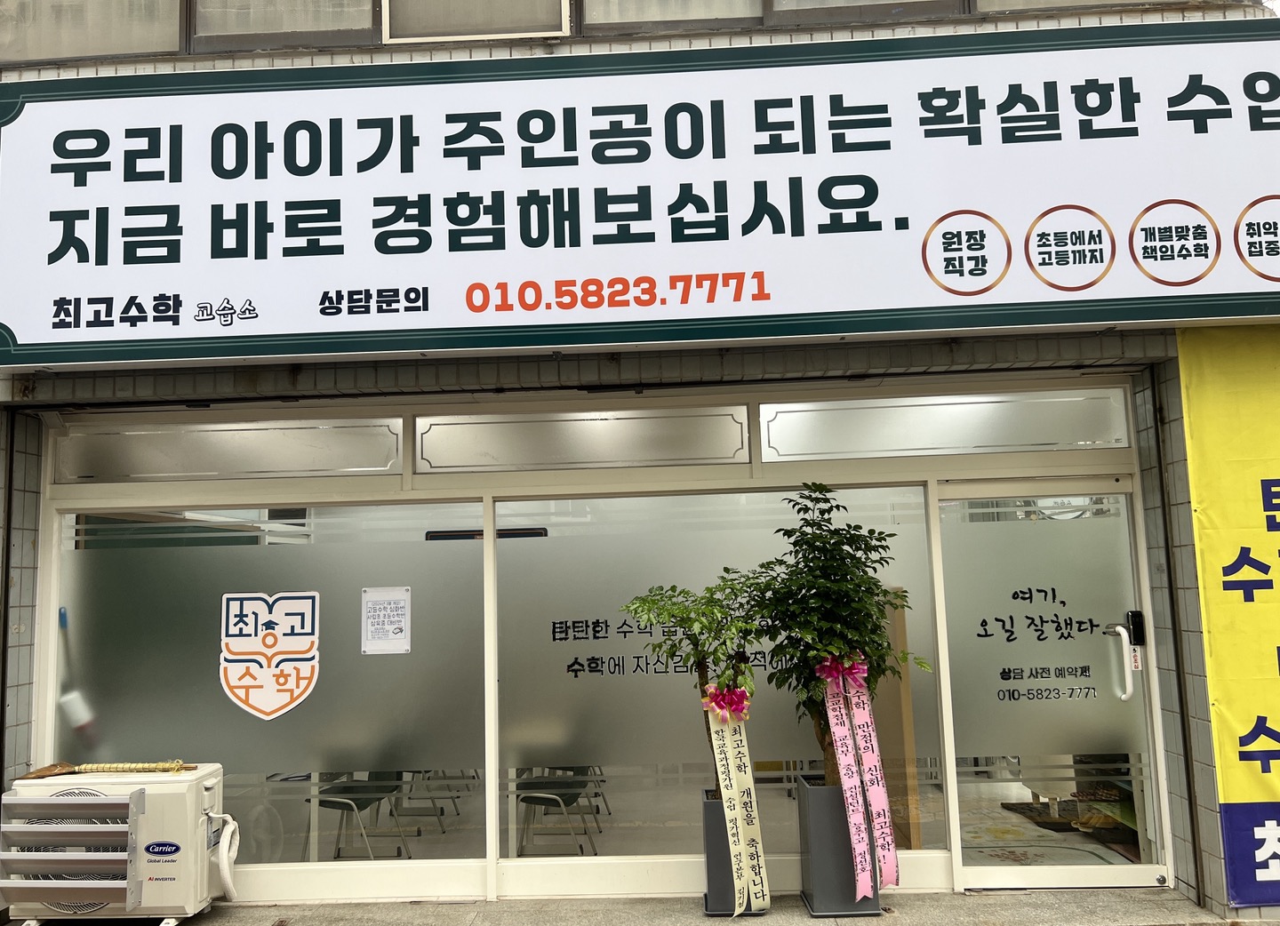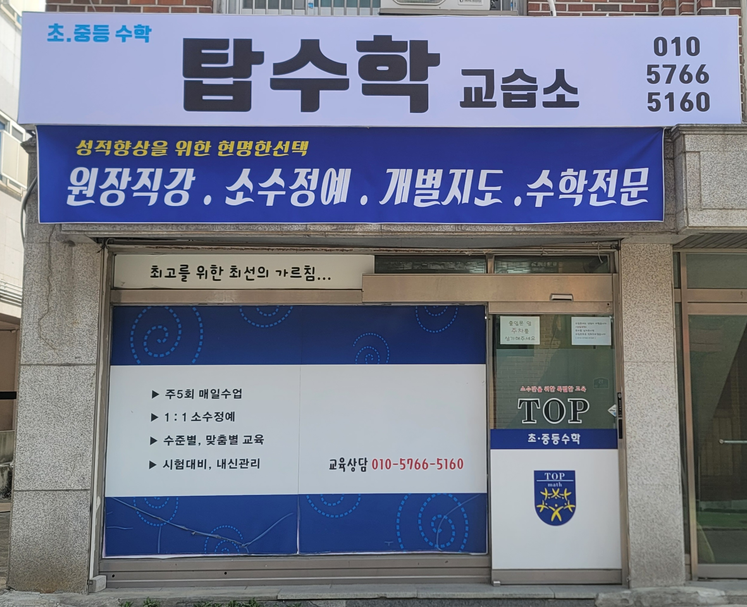 위치한 수학 교습소 현장입니다. 신규 상가는 뭔가 설레게 합니다~ 아무것도 그려지지 않은 빈 도화지... 그러나 저희가 누굽니까~ 이쁘게 하이탑수학교습소 로고를 만들었고요~ 현장 외관이 깔끔하게...