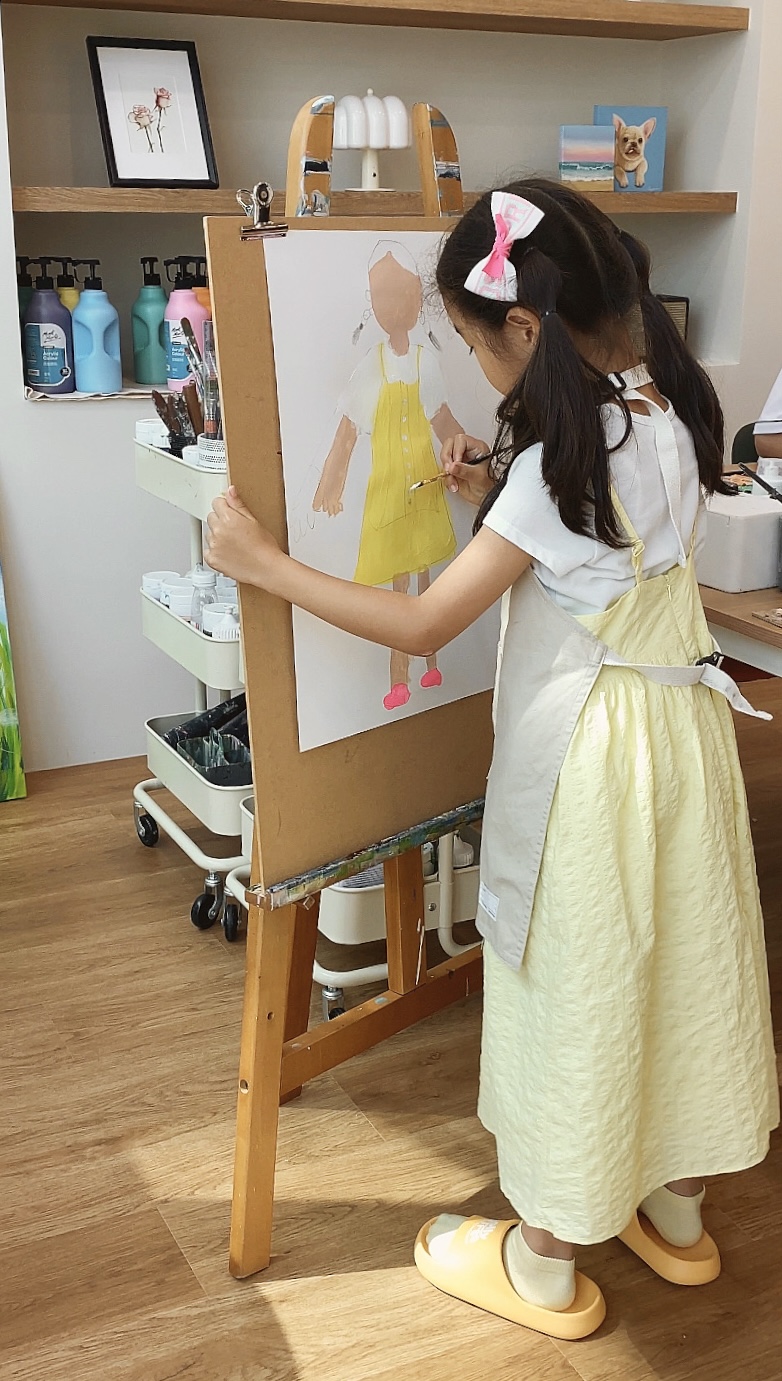 크록스에서 공룡 실내화로 갈아신었어요~ 미술교습소 답게 이젤도 있었고 할로윈 시즌이라 이쁘게 꾸며두셨어요! 다양한 예시를 보여주셨는데 이미 데몬헌터스 더피 생각하고 왔기에 사진을 전송하니까...