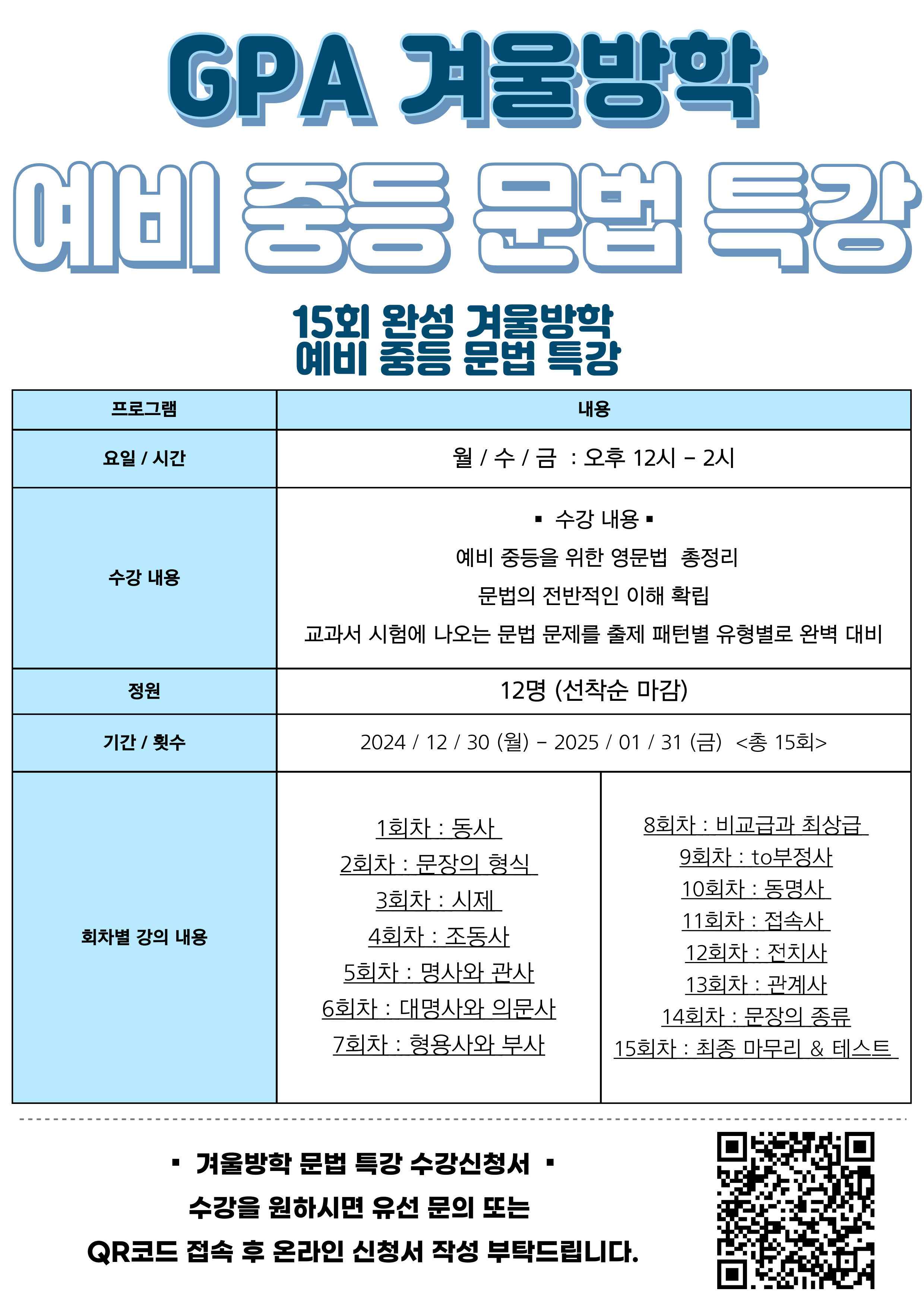 그렇다면, 지피에이영어학원의 커리큘럼은 어떻게 구성되어 있을까요? 2. 반포동 영어학원 GPA, 중등 문법 커리큘럼 반포동 영어학원 GPA 커리큘럼은 두 가지로 나누어집니다. 1. 예비 중등 문법 특강 2. 중등 및...