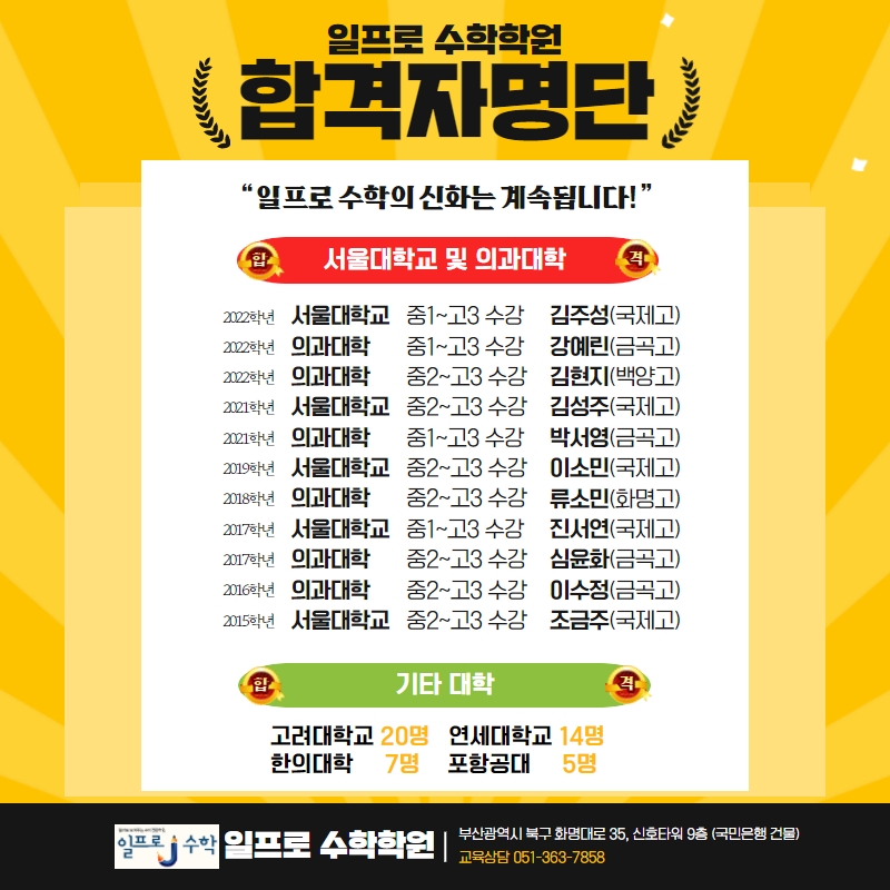 광고 없이 성장한 대치동 수학학원 일프로 수학학원은 개원 이후 단 한 번도 광고를 하지 않았습니다.... 이어진 학원입니다. 학부모들이 말하는 일프로 “공부를 자기 일처럼 하는 아이로 바뀌었어요.”...