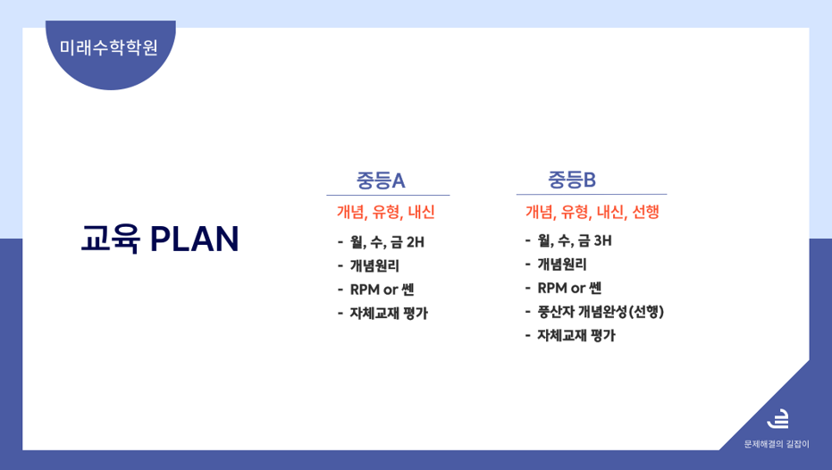 저희 검단신도시 검단 Y.B 영어 수학 전문학원에서는 아이들의 문해력과 서술형 능력을 키워주기 위하여 초등고학년부터 문제해결의 길잡이 교재를 이용하여 아이들의 풀이 능력을 키우는 커리큘럼을...