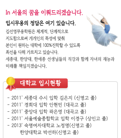 상인동 무용학원 성인 취미 발레 "김선영무용학원" 김선영무용학원을 지나가면서 종종 봤는데 성인... 상인동에 이런 실력 있는 무용학원이 있는 걸 이번에 알게 되었다. 김선영 dance academy 진학 현황 세종대...