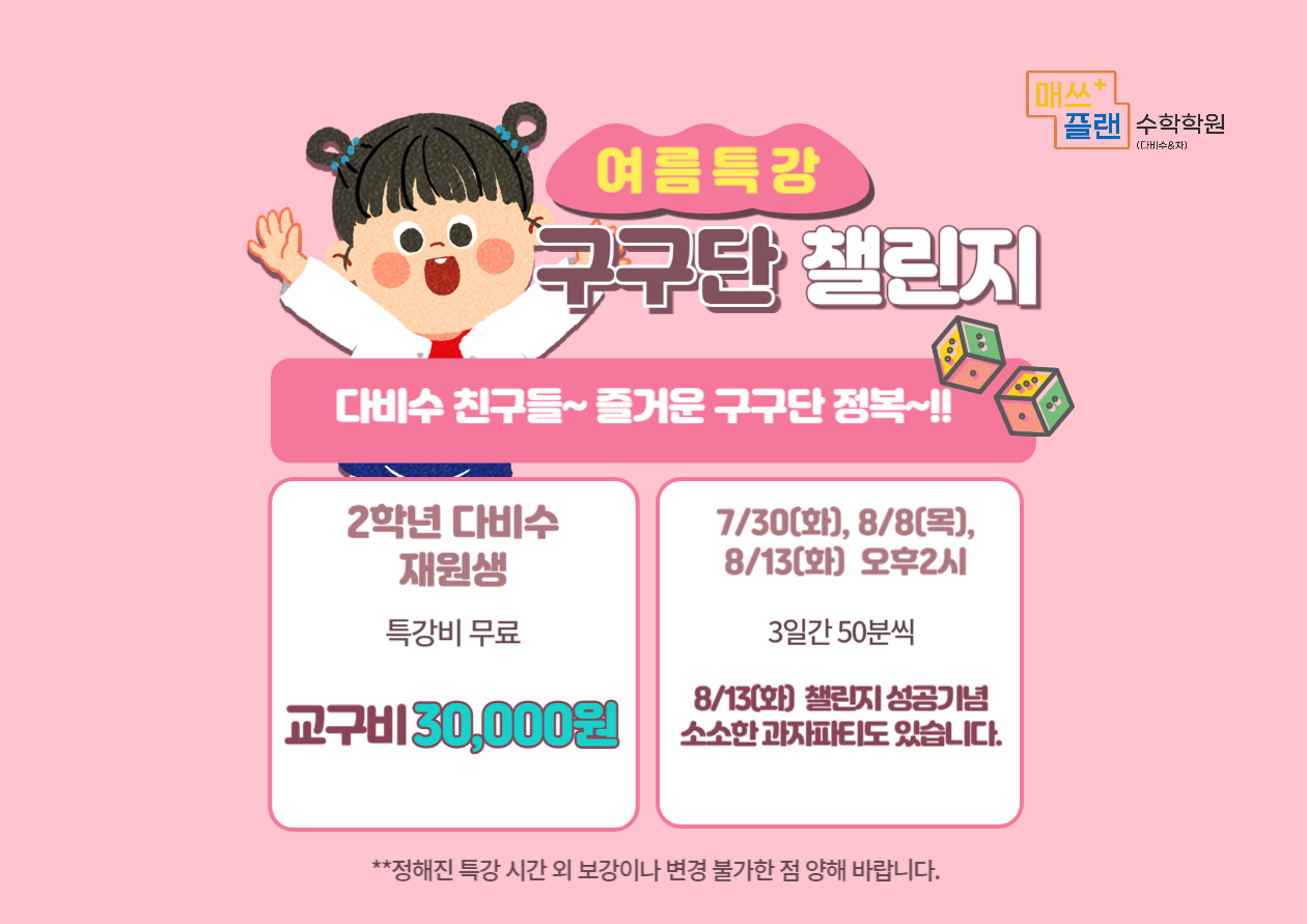 예비초1~초2 수업(주2회) - 주1회 다비수 수업+주1회 수학교과 수업 *다비수 수업이란? 다비수(다양한... 수학학원 매쓰홀릭 전국 월간평가 수능사고력 연산과 리딩앤써 프로그램은 다른글에서 더 자세히...