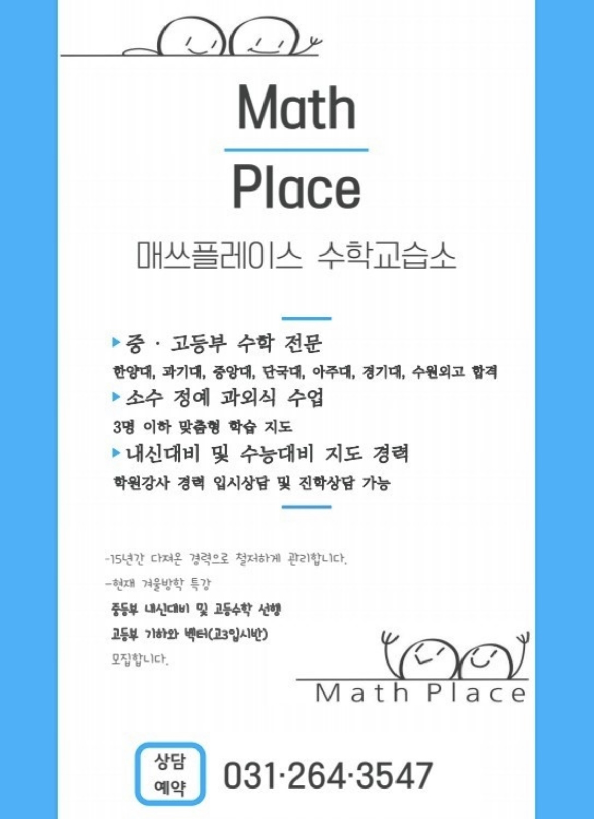 최고의 학습환경과 체계적 대입 시스템 매쓰플러스수학교습소 매쓰플러스수학은 우리 아이들의 학습 집중도를 극대화하기 위해 많은 공을 들였습니다. 최신 전자칠판을 활용한 개념 설명, 넓은 책상과 편안한...