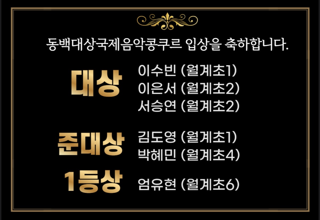 ⭐️동백대상국제음악콩쿠르 2학년 <대상> 입상을 축하합니다 ⭐️ 안녕하세요 옥현새론피아노... 개인별 수준별 커리큘럼 적용 ✔️ 다양한 레파토리 ✔️ 주5회반/주3회반/토요반 운영 옥현새론피아노교습소
