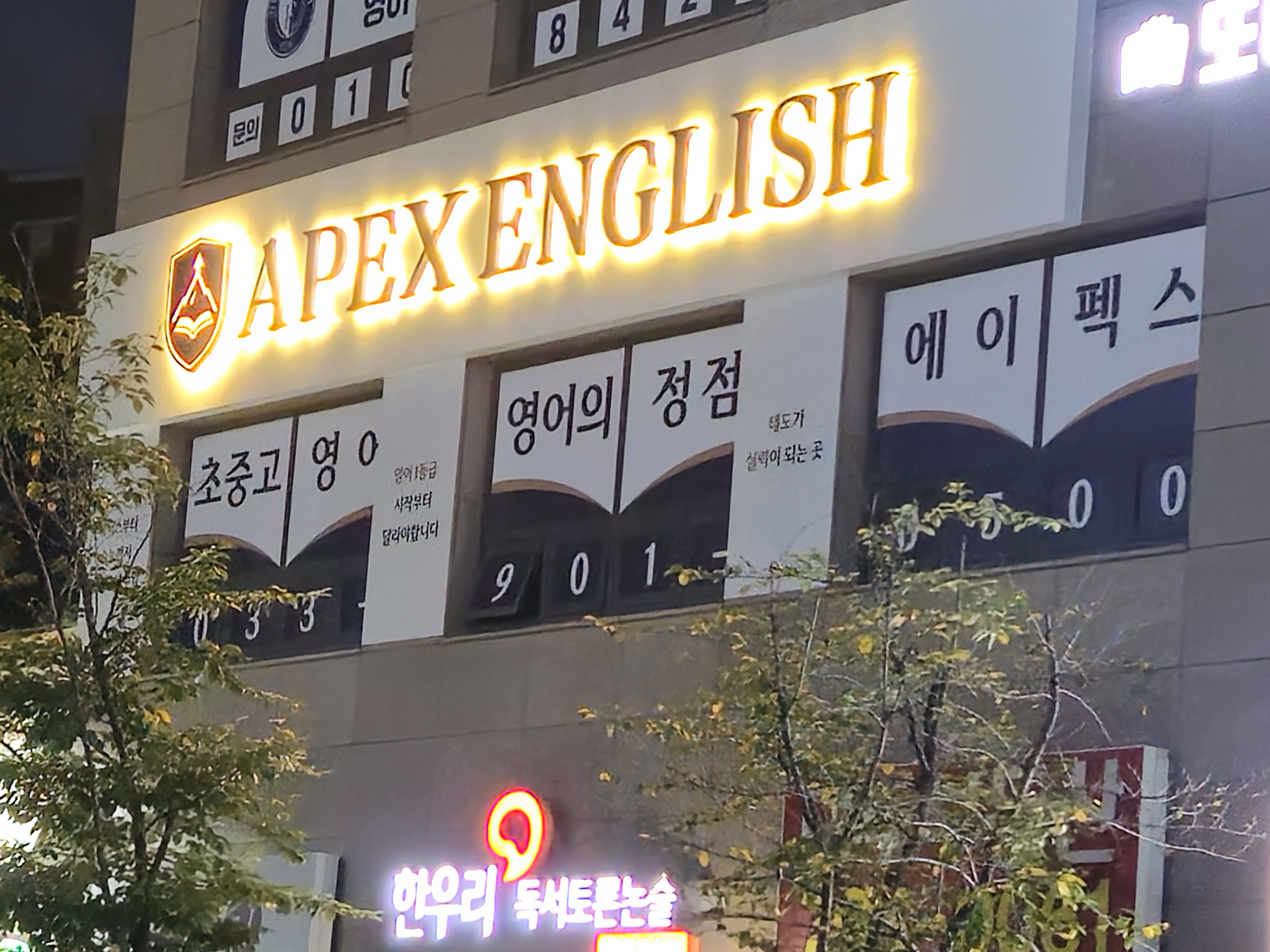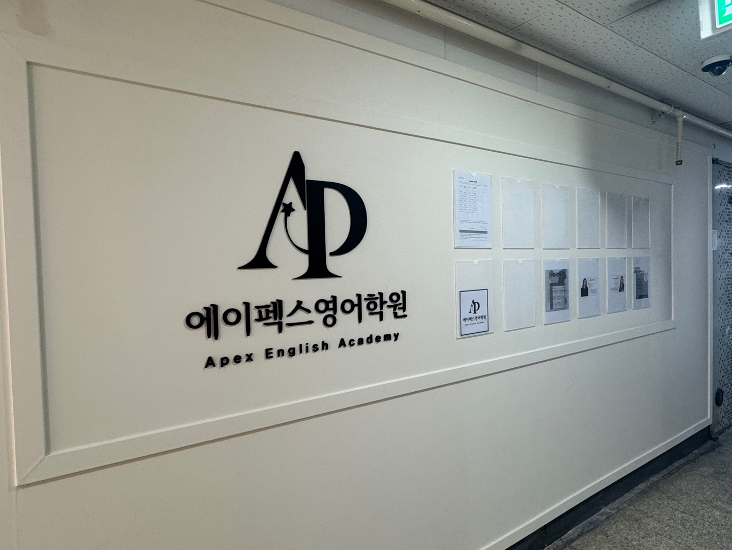 현장은 에이펙스라고 하는 영어 교습소입니다 SAT, 토플 등을 전문으로 하는 곳으로 간판이 눈에 잘... 있는 에이펙스 영어 교습소의 채널 간판입니다 깔끔한 건물의 외관에 무리없이 잘 녹아 들어서 보기에...