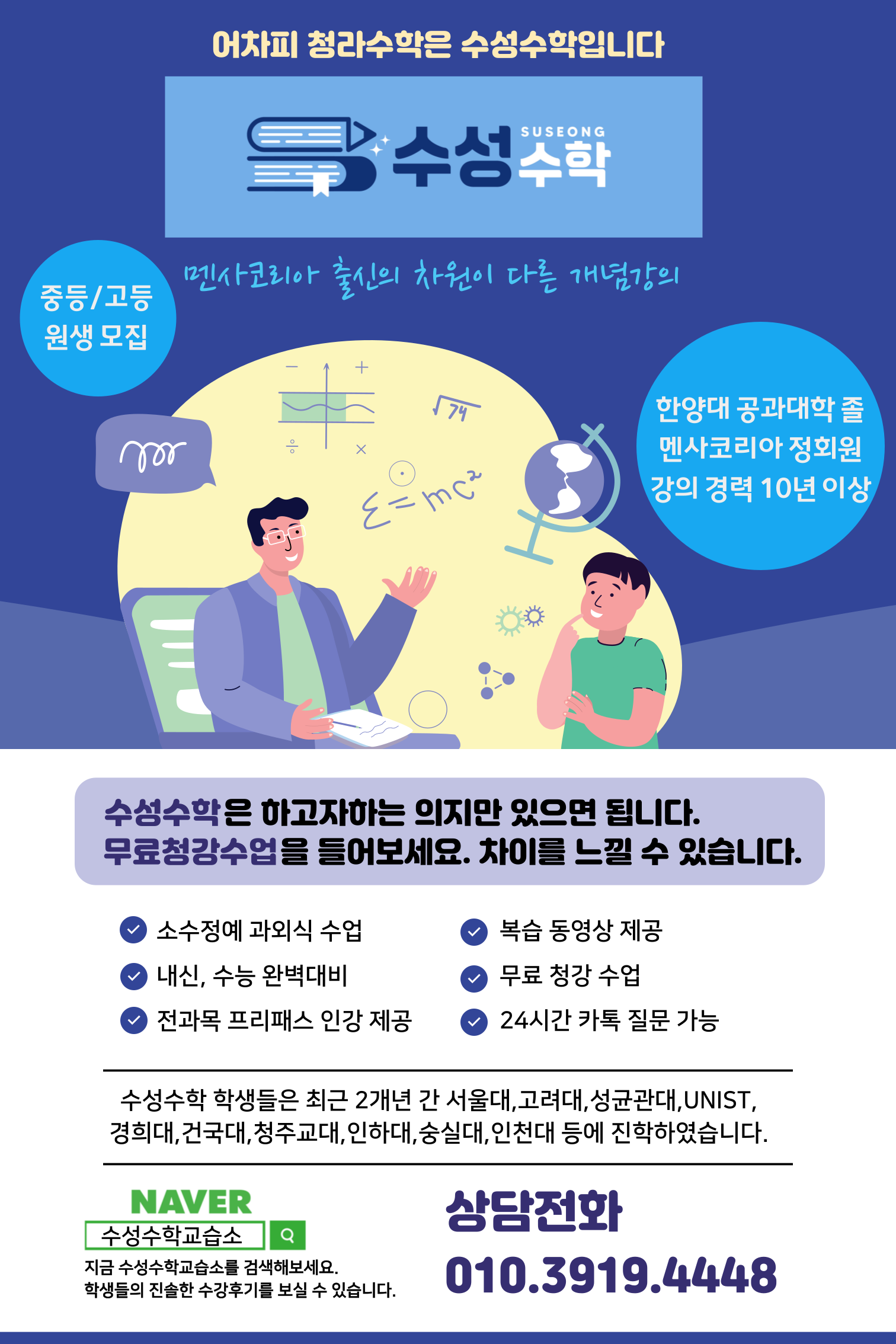 과학과 수학을 믿고 맡길 수 있는 곳을 찾으신다면 정성곤 과학교습소와 수성데카르트 수학교습소를 찾아주십시오