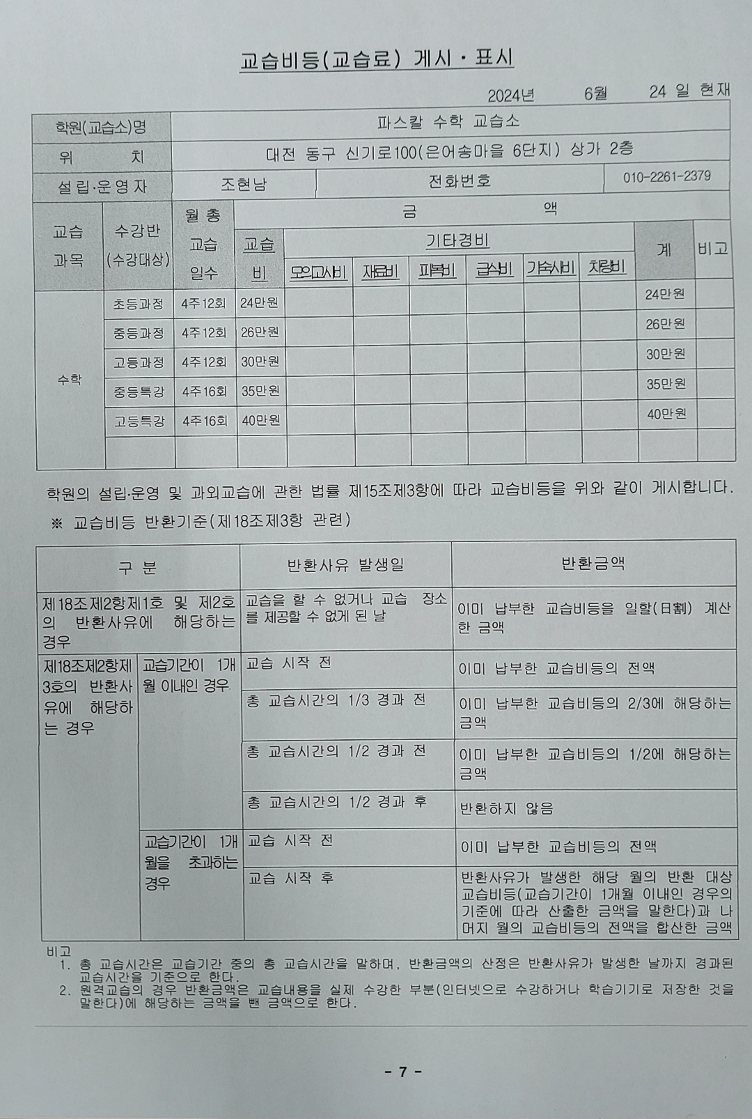 파스칼 수학 수강료 안내