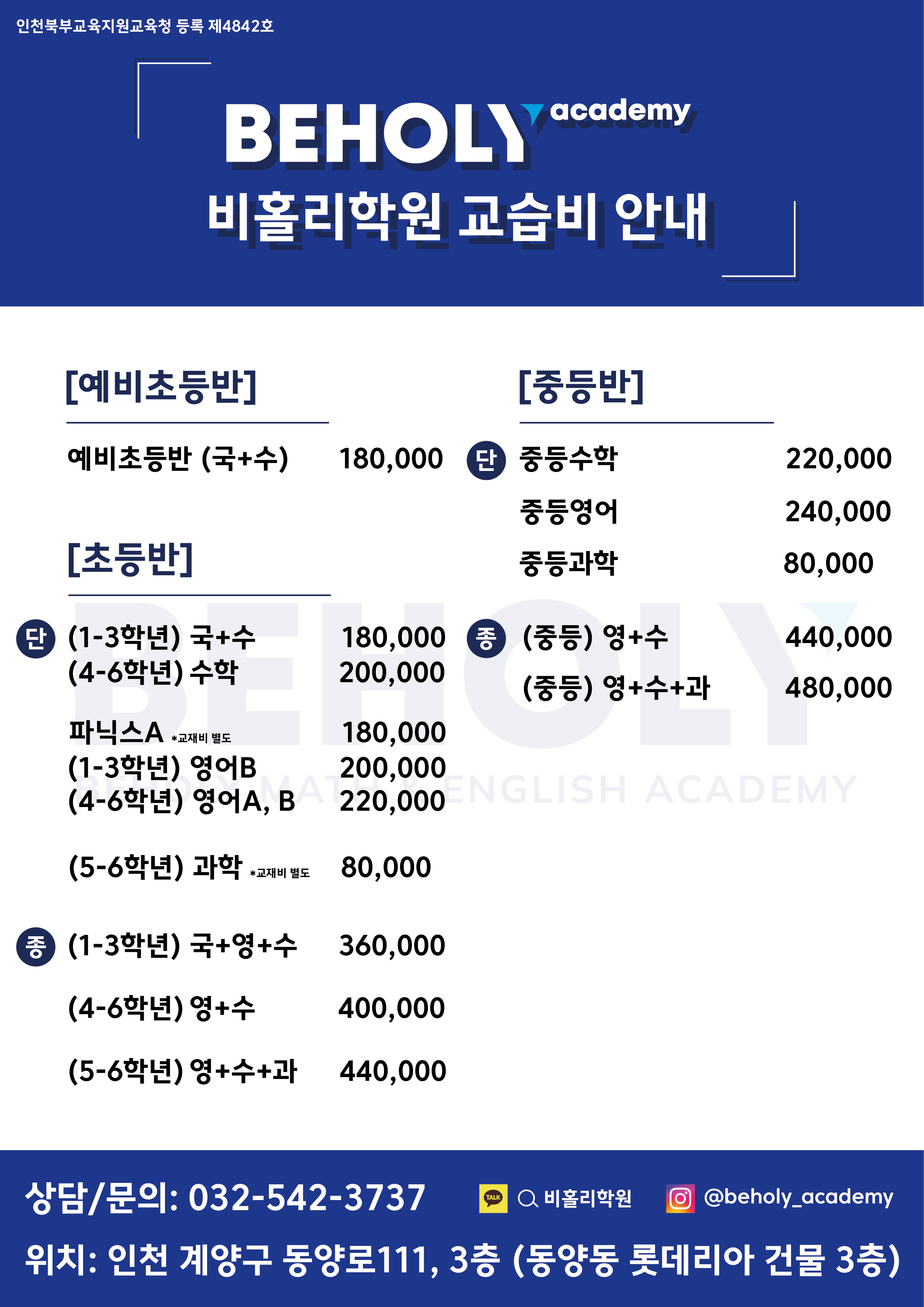 비홀리학원 교습비 안내문