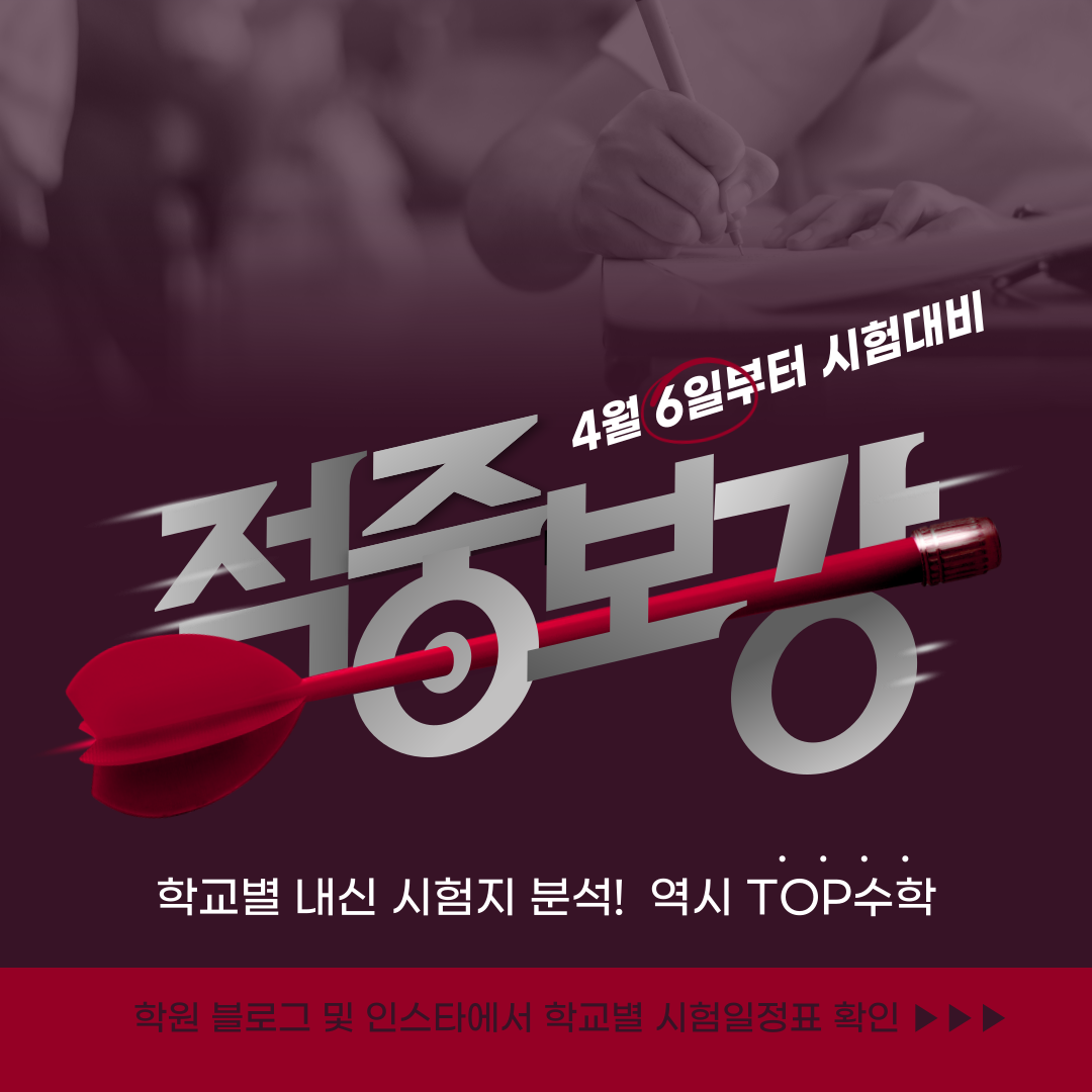 길벗의 비밀 무기라고 자부할 만큼의 적중률 높은 문제가 엄선되어 있습니다. 목동수학학원 길벗아카데미의 중간고사 내신대비 무료특강 듣고, 성적 수직 상승! 함께 해내 봅시다~