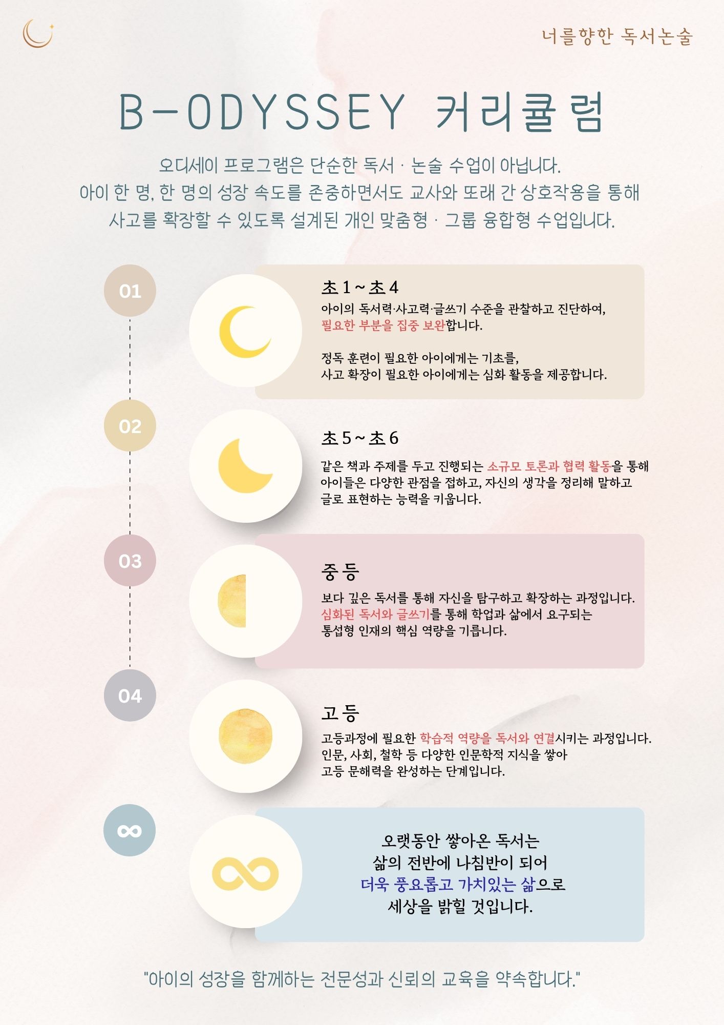 너를향한 독서논술은 단순히 성적을 올리기 위한 학원이 아니라, 아이들이 책을 통해 세상을 배우고 자신만의 목소리를 글로 표현할 수 있도록 도와주는 교습소라는 생각이 들었습니다 언제나 아이 중심으로...