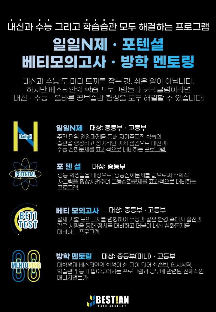 안녕하세요 청라 베스티안 수학학원입니다! 매주 Weekly Best!an으로 여러분들께 베스티안의 소식과 학생들이 어떻게 공부하는지 전달해드립니다! 포텐셜 25년 3분기 우수학생 시상!! 청라, 개봉(서울), 하안(광명)...