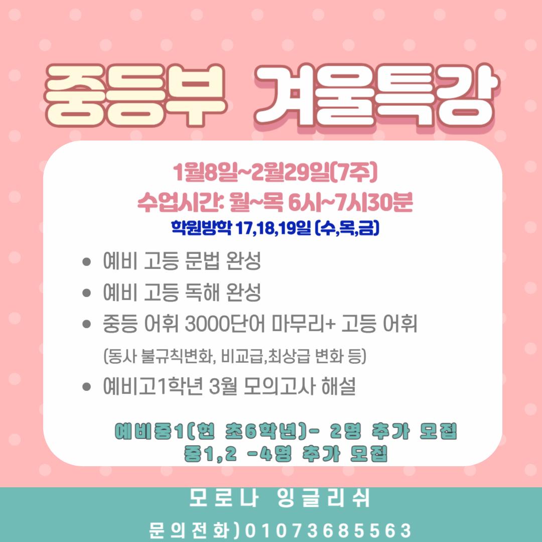 좌동 영어학원 케어잉글리쉬가 제대로 가르치겠습니다. ✔ 주의사항: 고1 모고 특강은 수업시간... [등록·신고번호] 제2472호 [학원·교습소 명칭] 케어잉글리쉬학원 [교습과정] 실용외국어(초·중...