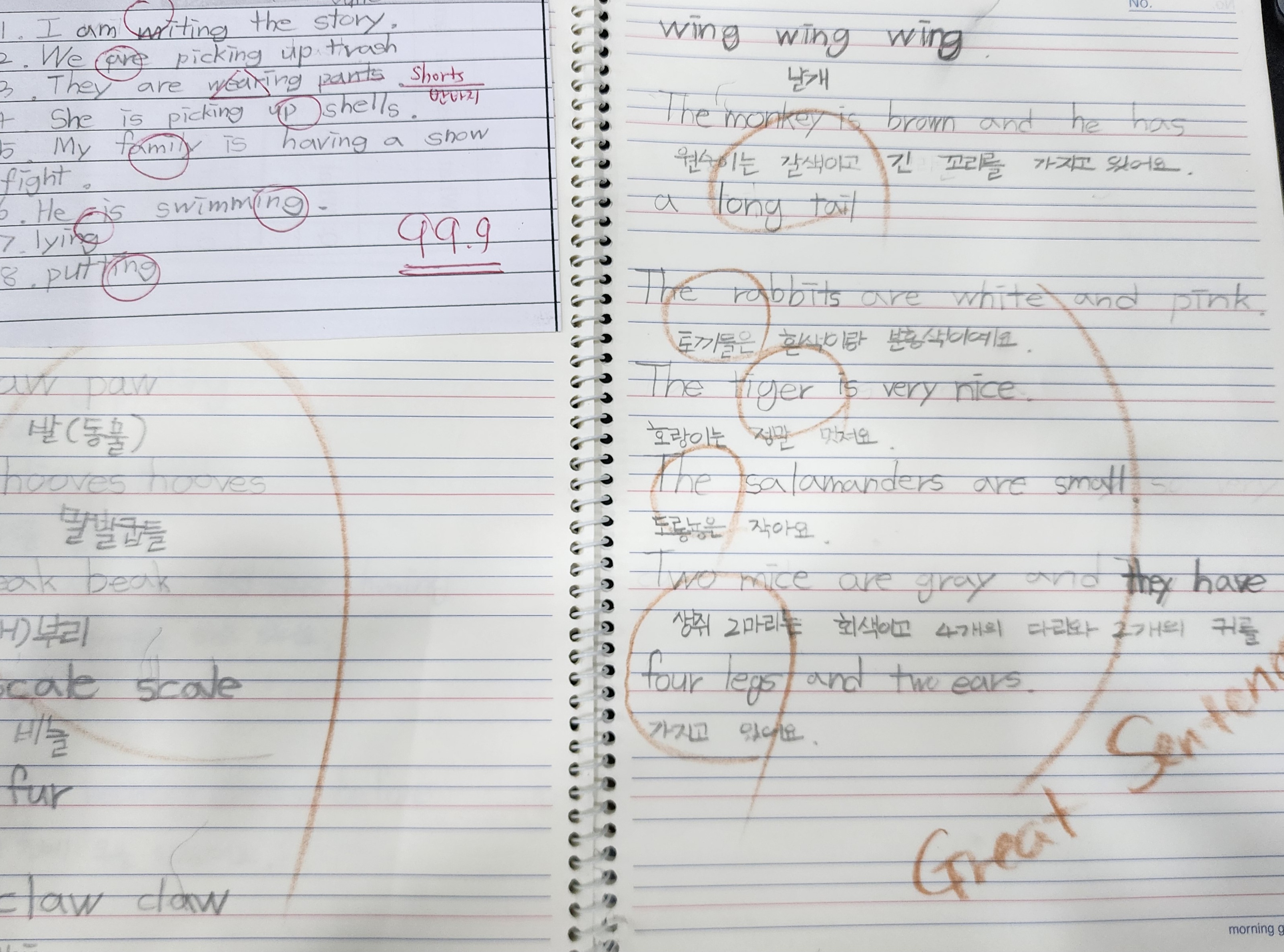 이 과정 속에서 아이들은 자연스레 문법을 배우지 않아도 영어기본문장구성과 간단한 문법규칙들을... 그냥 spelling과 뜻 외우기도 처음 해보는 아이들은 힘든데, 그 단어를 어떻게 소리내는지, 그리고 영어문장...