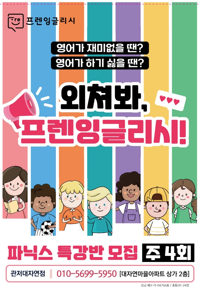 “책을 안 읽던 아이가 수업 후엔 영어책을 먼저 찾아요!” “문법이 어렵다고만 했던 아이가 이제는 문제를 스스로 풀어요!” 산동 초등영어교습소 프렌잉글리시 7월 무료 체험 수업 중! 자리 마감되기 전에...