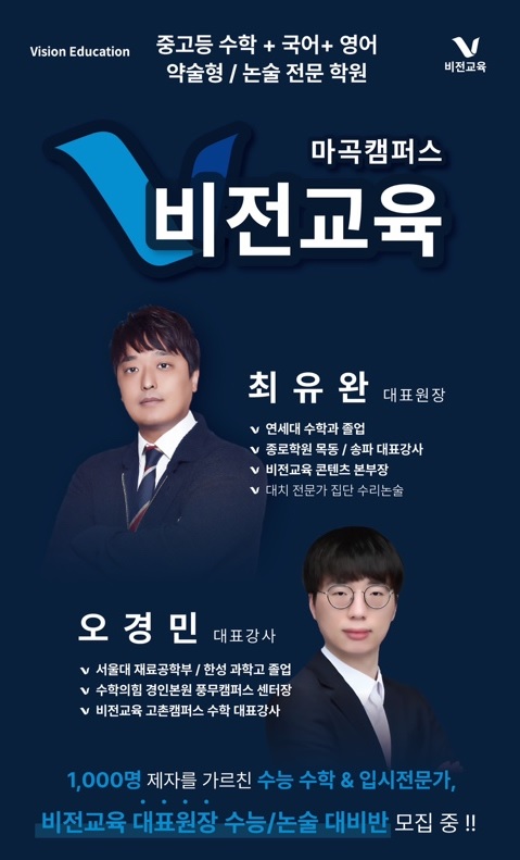 이름 : 비전교육 마곡캠퍼스 도로명 주소 : 공항대로 103 업무시설동 902호 ● 영업시간 - 월 11:00 ~ 22... 목동, 마곡, 김포 고촌, 풍무 국어, 수학, 영어, 과학 전문 중고등 입시학원 '비전교육'이...
