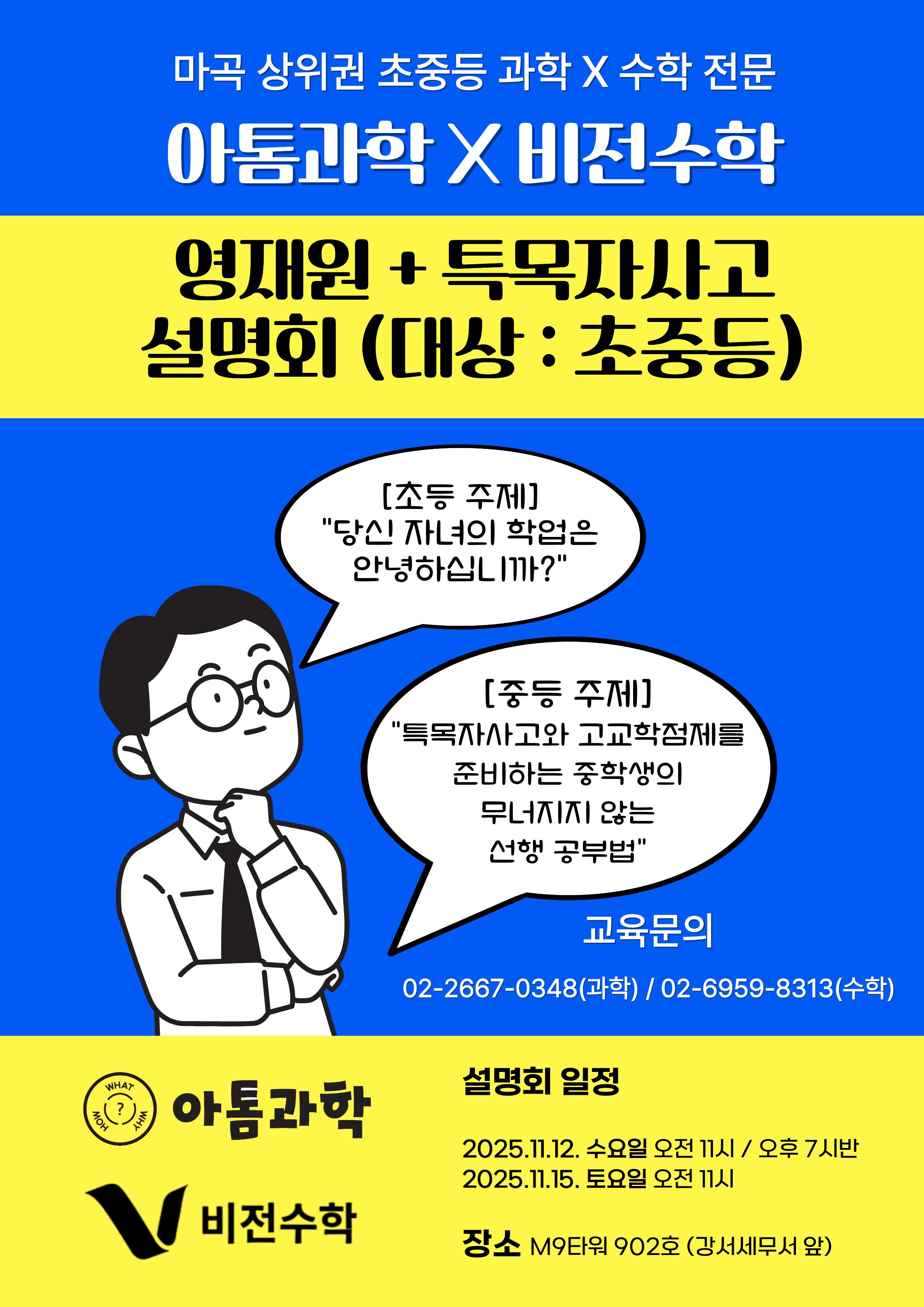 전문 학원을 운영하고 있습니다~ 공항초와 강서세무서 앞에 위치한 비전교육 마곡캠퍼스는 초중등 수학과 아톰과학을 연계해 체계적인 특목·자사고 대비가 가능하며 특목·자사고를 지망하는 상위권...
