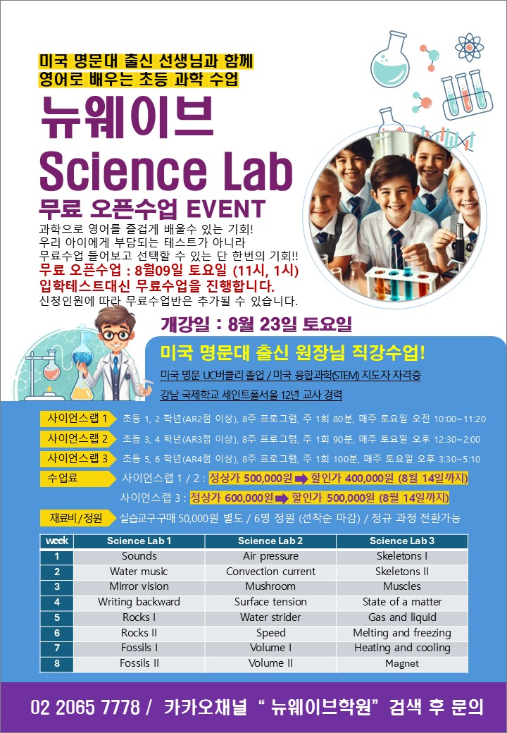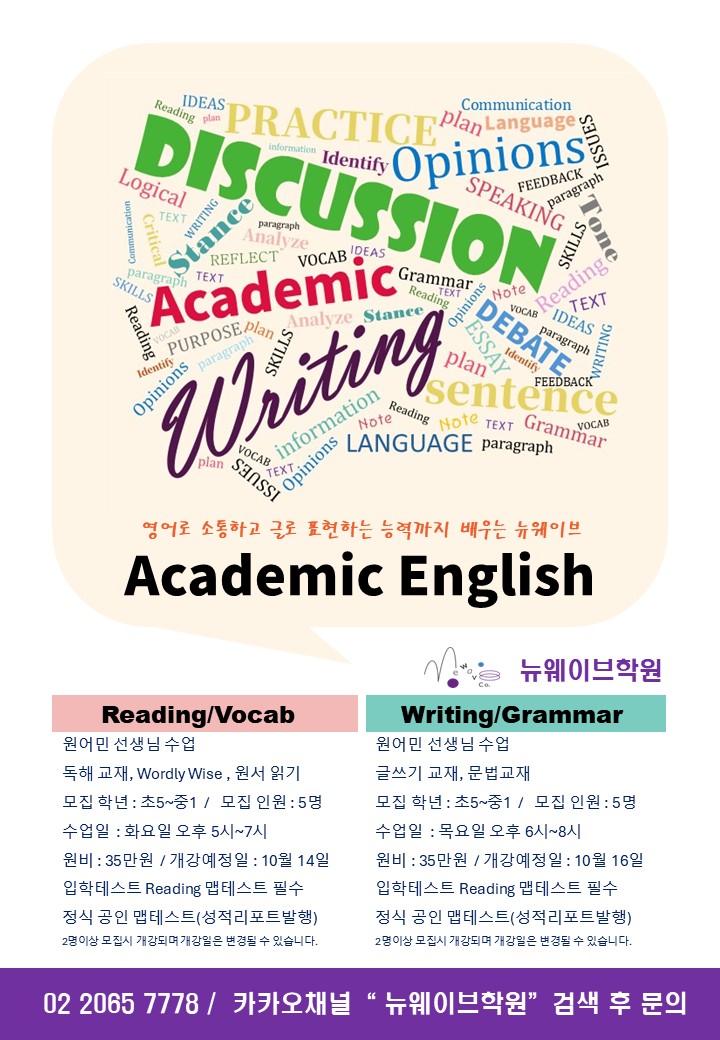 그러다 집 근처인 목동에도 국제학교 입학 준비 전문 학원인 뉴웨이브 영어학원을 발견했죠. 상담하고... 국제학교 입학 준비 과목 실제 클래스 모집 공고 뉴웨이브학원은 영어 4대영역(리딩, 라이팅, 스피킹...