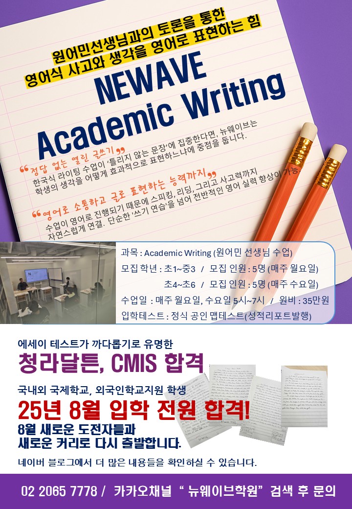 그 이야기를 듣고 단순히 영어 실력이 아닌 자신의 생각을 전해야되는 것도 중요하다는걸 깨달았어요. 4. 뉴웨이브 학원의 가장 큰 강점 솔직히 찾아가기 전에 생각한 건 입시만 도와주는 학원 아닐까? 하는...
