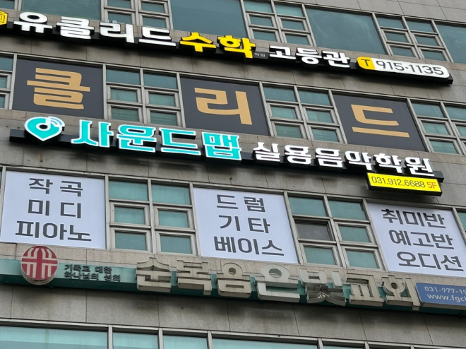 외부 사운드맵 실용음악학원은 탄현역 2번 출구에서 도보 8분 거리에 위치해있어요. 올리브영 건물 5층에 위치해있어요. 학원, 스터디 카페가 있다 보니 엘리베이터에 학생들이 많았어요. 실용음악학원과...