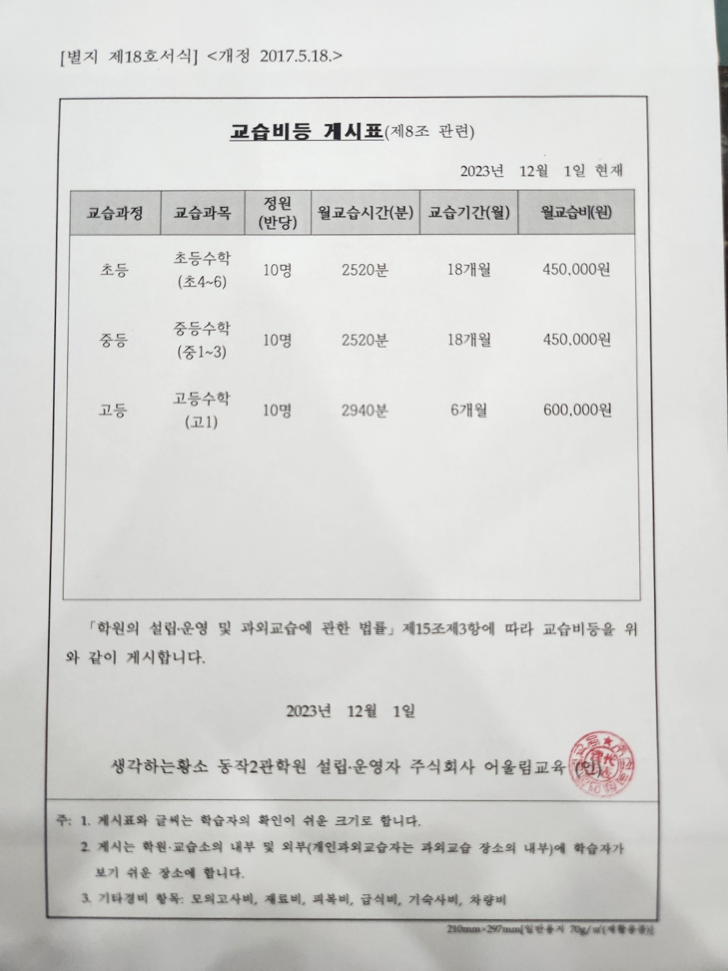 교습비 안내(생각하는황소마포점,생각하는황소마포점2관학원)