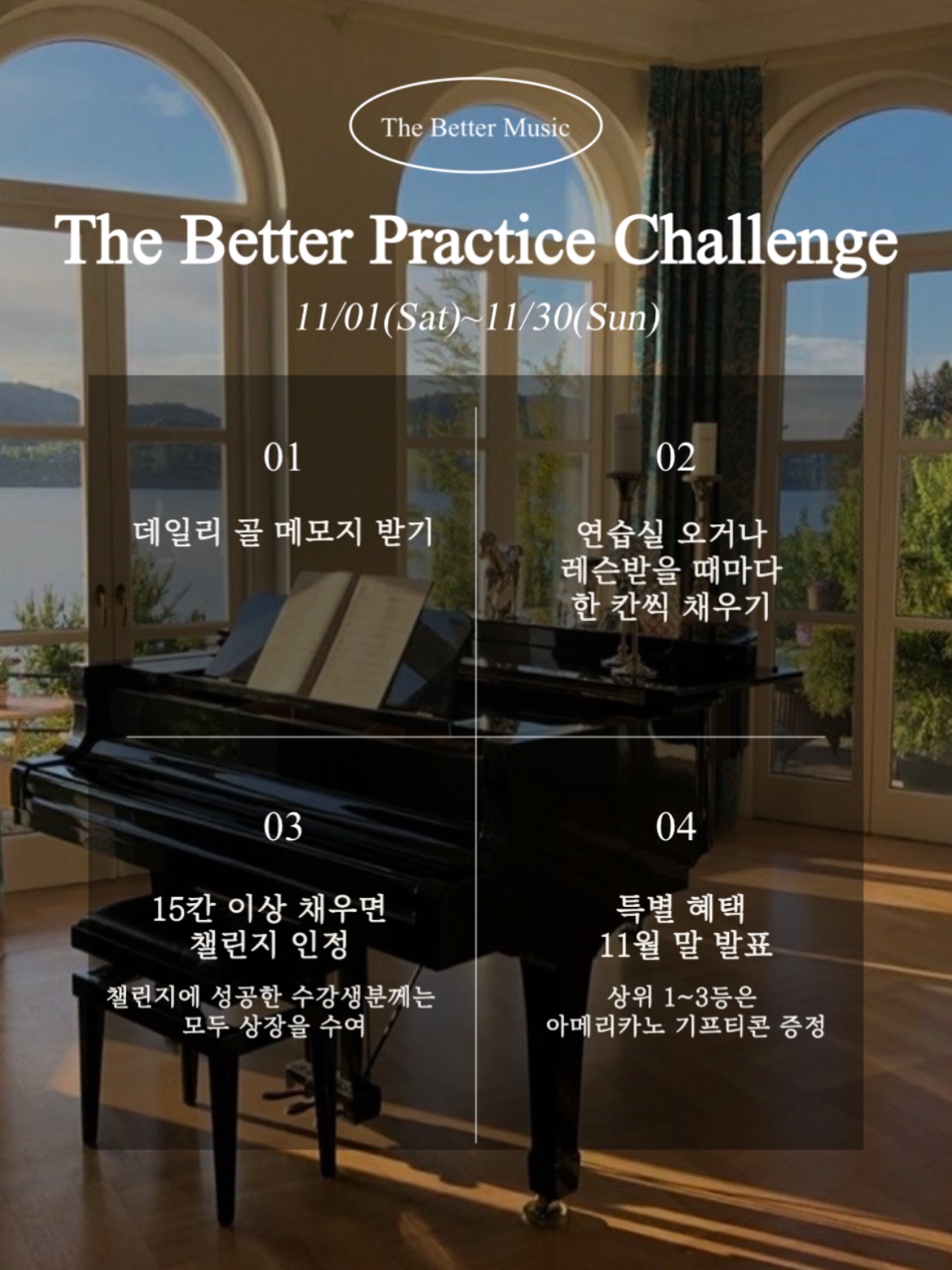 올라오면 더베럴뮤직 학원 입구가 나옵니다. 내부 더베럴뮤직은 피아노, 기타, 바이올린 수업을 수강할 수 있는 학원입니다. 입구 옆 쪽에는 피아노 수업을 수강할 수 있는 공간이 있습니다. 선생님이 인기가...