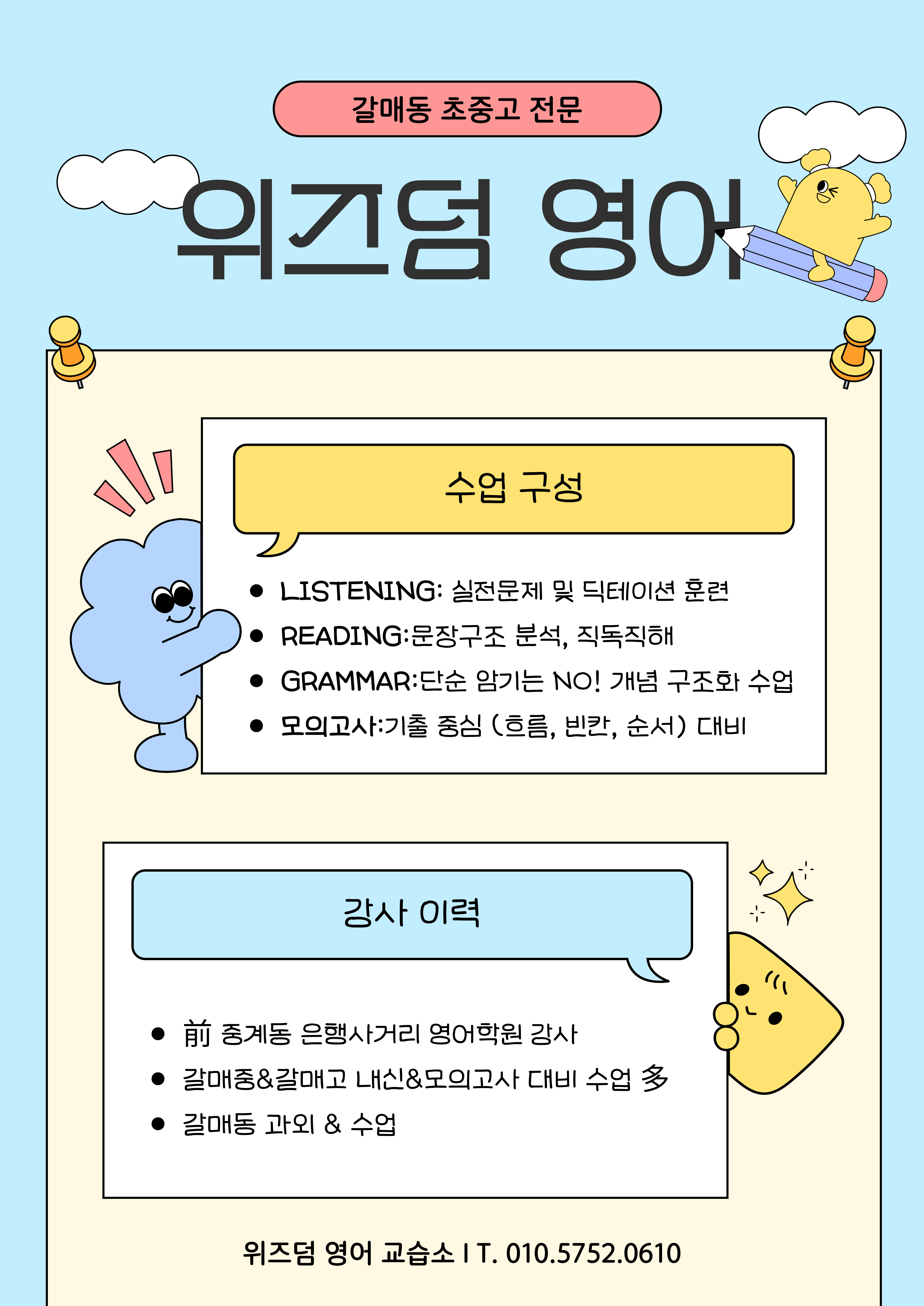 상담 및 문의 010-****-**** (위즈덤영어 교습소) 등록번호:제 3340호 아이 한 명, 한 명의 눈높이에 맞춘 수업으로 영어 실력을 차근차근 쌓아갈 수 있도록 늘 함께하겠습니다. 감사합니다. – 위즈덤영어 드림...
