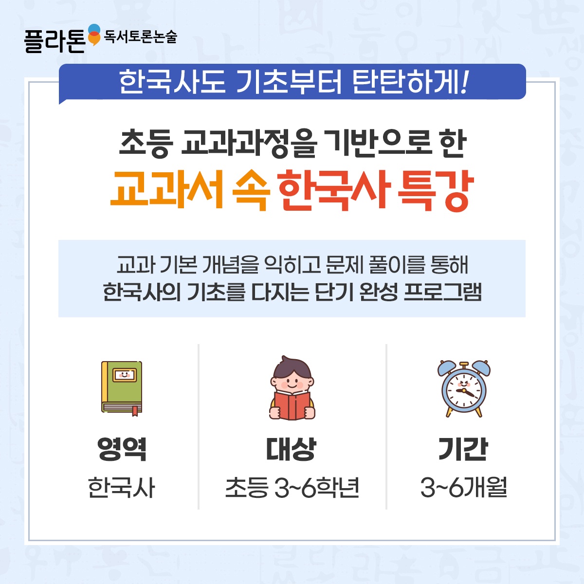 결국 모든 수행평가가 쉬워집니다 플라톤 토비논술교습소에서는 글쓰기만 가르치지 않습니다. 교과를 뒷받침하는 독서력–사고력–논술력을 함께 키웁니다. 읽어서 이해하고, 이해해서 쓰는 힘. 그게...