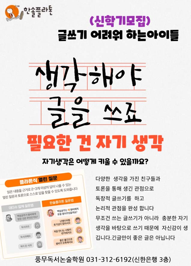 미리 생각을 정리합니다. 학원에서는 전문 논술강사와 학생들과 토론 후 글쓰기로 논점을 정리하고... 언제든 편하게 연락주시면 아이의 현재 독서와 문해력 상태, 학습 고민에 대해 함께 이야기하며...