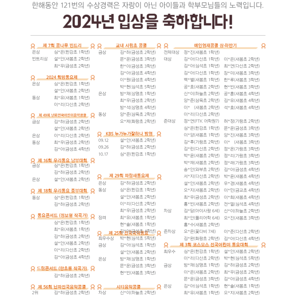 2023 콩쿨수상내역 다산 피아노천사음악학원