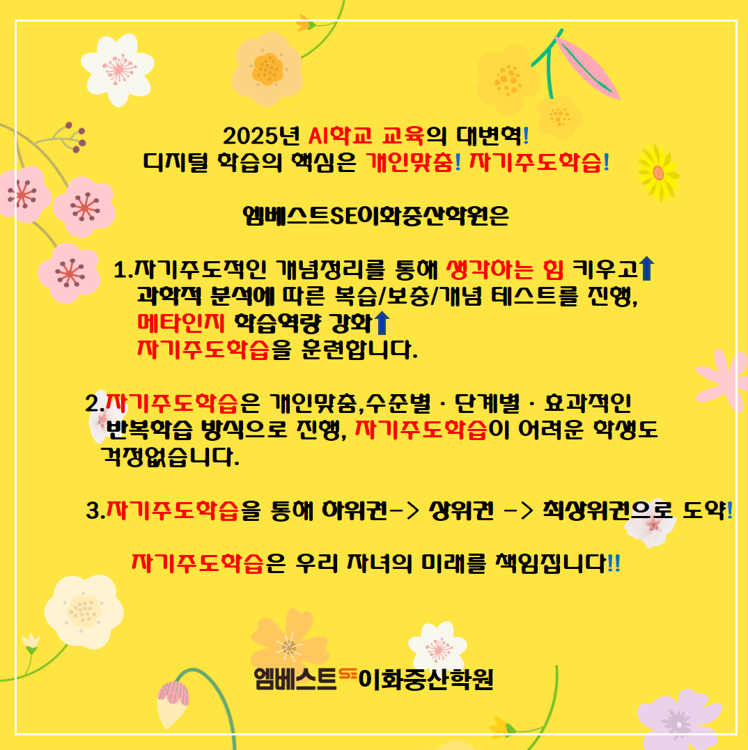 안녕하세요 엠베스트SE입니다. 25년 5월 ~ 7월 새롭게 개원한 엠베스트SE 학원과 홈과외를... 가맹점 엠베스트SE 화도캠퍼스 주소 : 경기 남양주시 화도읍 맷돌로 93 스타타워 5층 ☎️문의 : 070-7771...