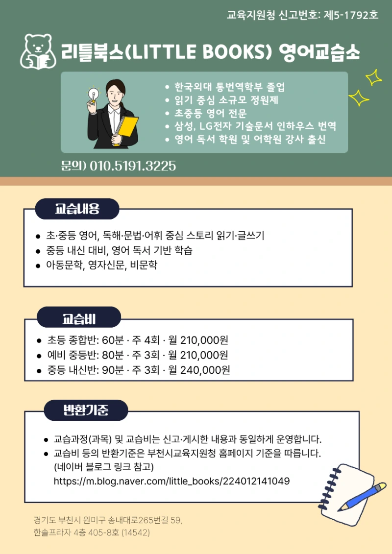 리틀북스(LITTLE BOOKS) 영어교습소 리틀북스 영어교습소는 부천 상동 지역 초,중등 대상 읽기 중심 영어 전문 교습소입니다. 읽기(Reading)를 바탕으로 문법, 어휘, 쓰기, 사고력을 함께 성장시키는 정독형...