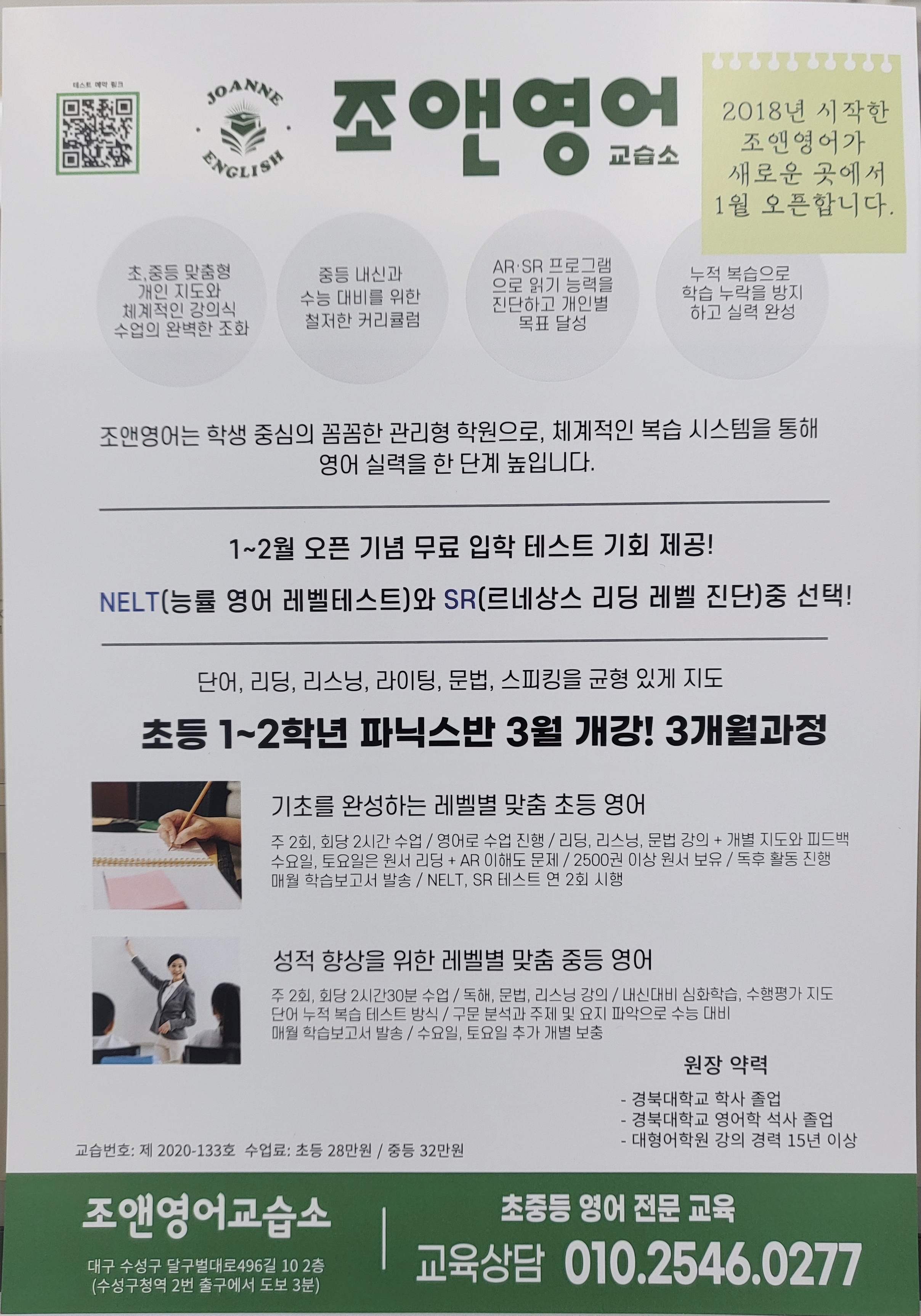조앤 영어는 작은 교습소입니다. 대형 학원이 시스템하고는 비교가 되지 못하죠. 18년째 영어강의를 하면서 깨달은 건, 언어의 기본을 탄탄하게 만들어 주면 높은 장벽도 거뜬히 뛰어넘을 수 있겠구나!...