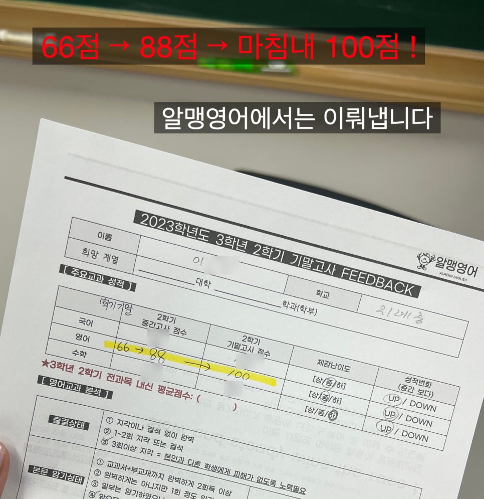 (스카/집/도서관/학원 등) 4) 공부하는데 방해되는 나쁜 습관을 갖고있지는 않은지 (자세/노래듣기/짧은... ↑ 알맹영어 교육상담 : 카카오톡 채널 '알맹영어학원' ↑ 알맹영어 오시는 길 / 연락처 ↑ 알맹영어...