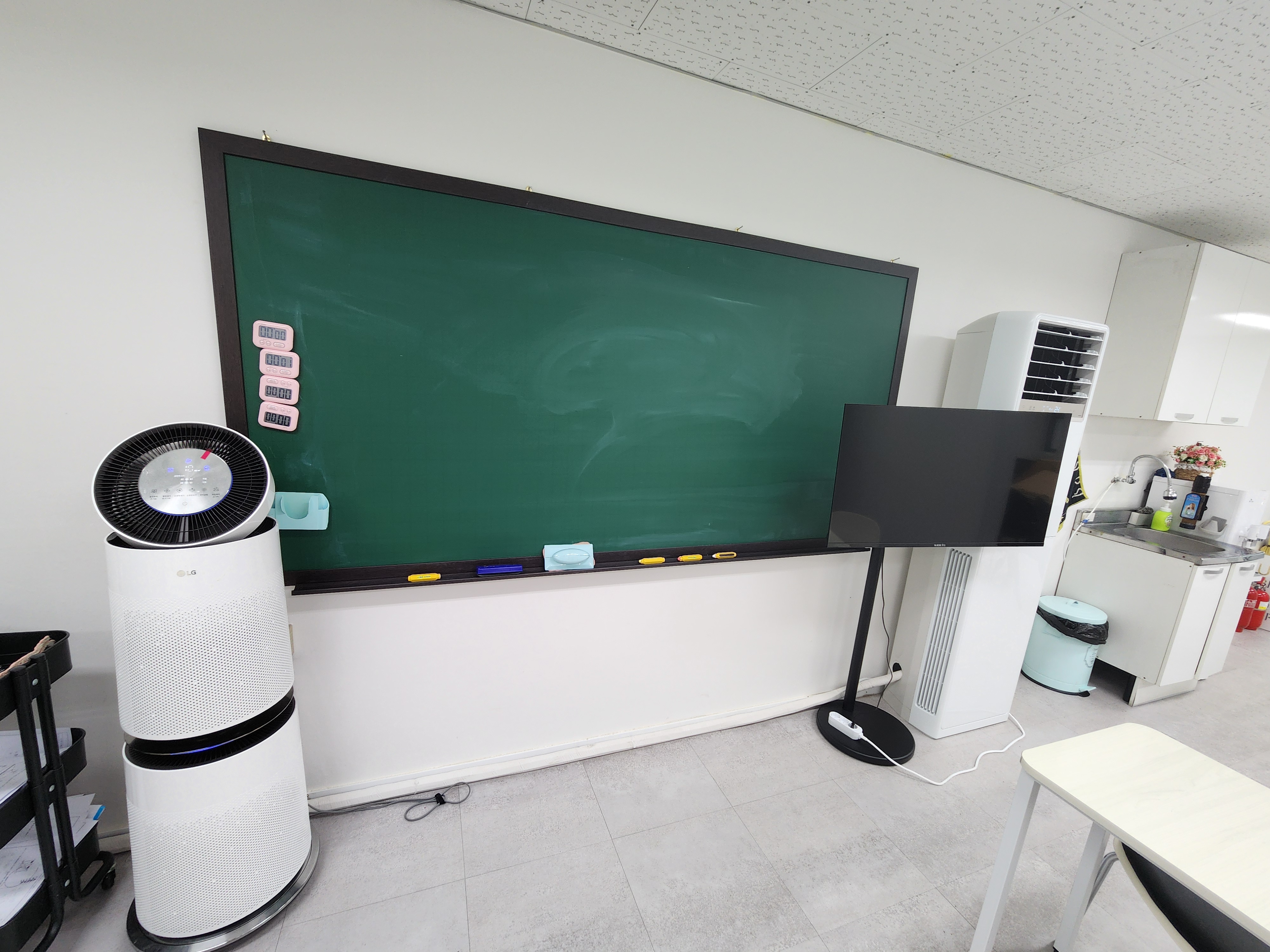 오늘의 현장처럼 암롤박스를 임대하여 그 의견을 모아 정하다 보니 집에 대한 로망이 컸는데... 벽면에는 수학교습소의 정체성을 드러내게 했었어요. 신발장은 하부 띄움을 시공하였으며 아래에는 간접조명으로...