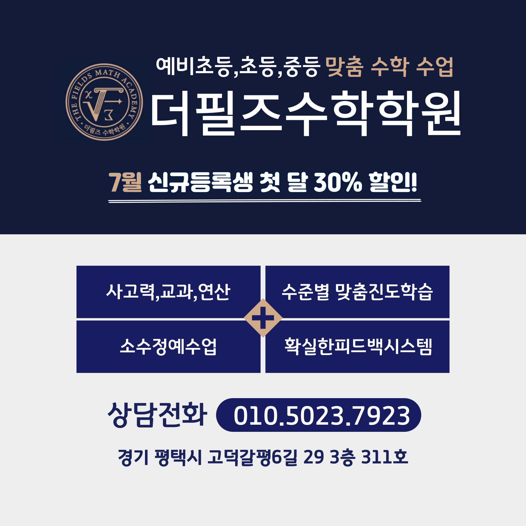 더필즈수학학원의 교육 철학 평택고덕수학학원 더필즈수학학원은 ‘개념이 탄탄해야 실력이 자란다’는 신념으로 수업을 구성합니다. 더필즈수학학원의 대표 특장점 정확한 개념 학습 조작·시각 자료...